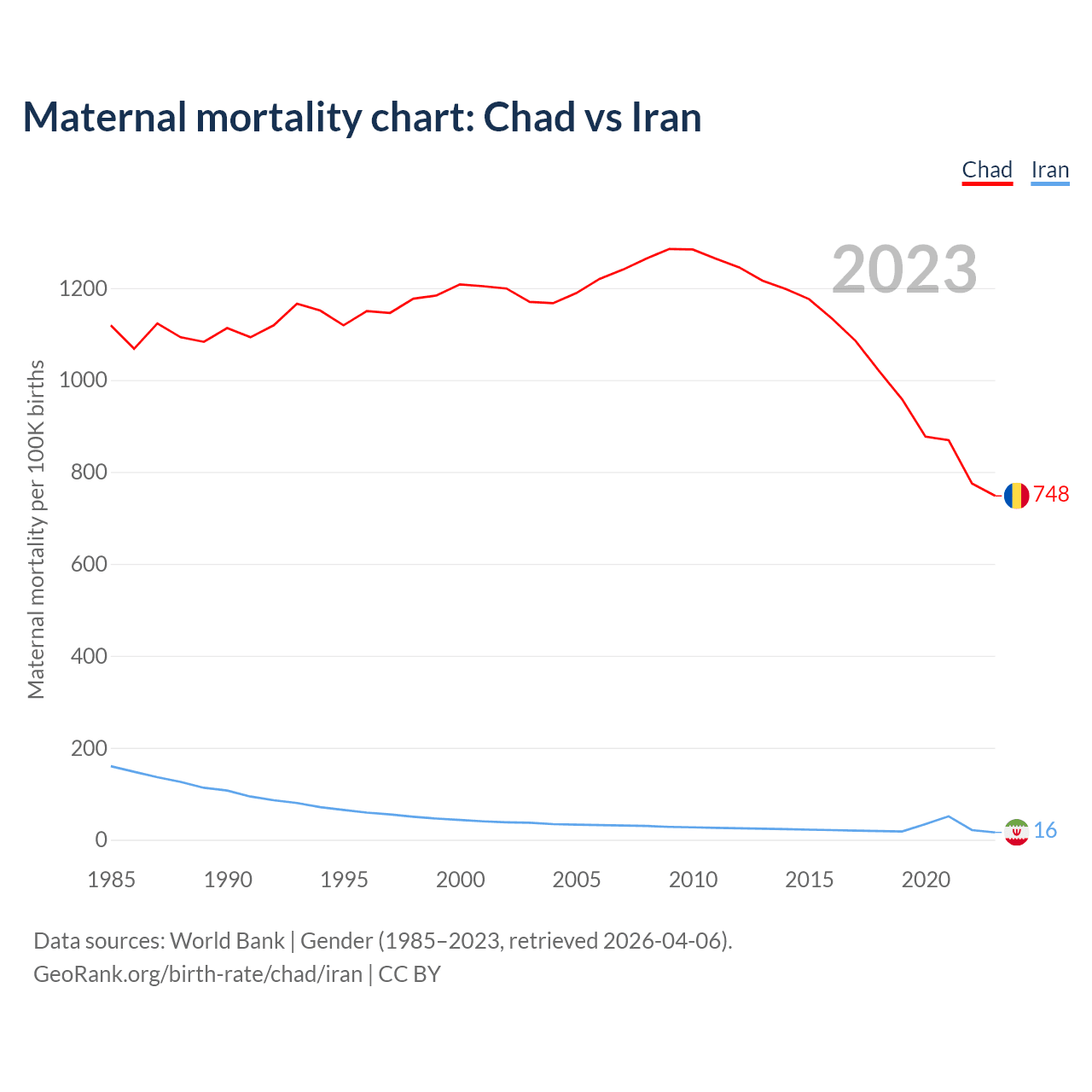 The maternal mortality rate, which is the probability of dying during childbirth or within 42 days of pregnancy termination, is 748 deaths per 100,000 live births in Chad, compared to 16 deaths in Iran.