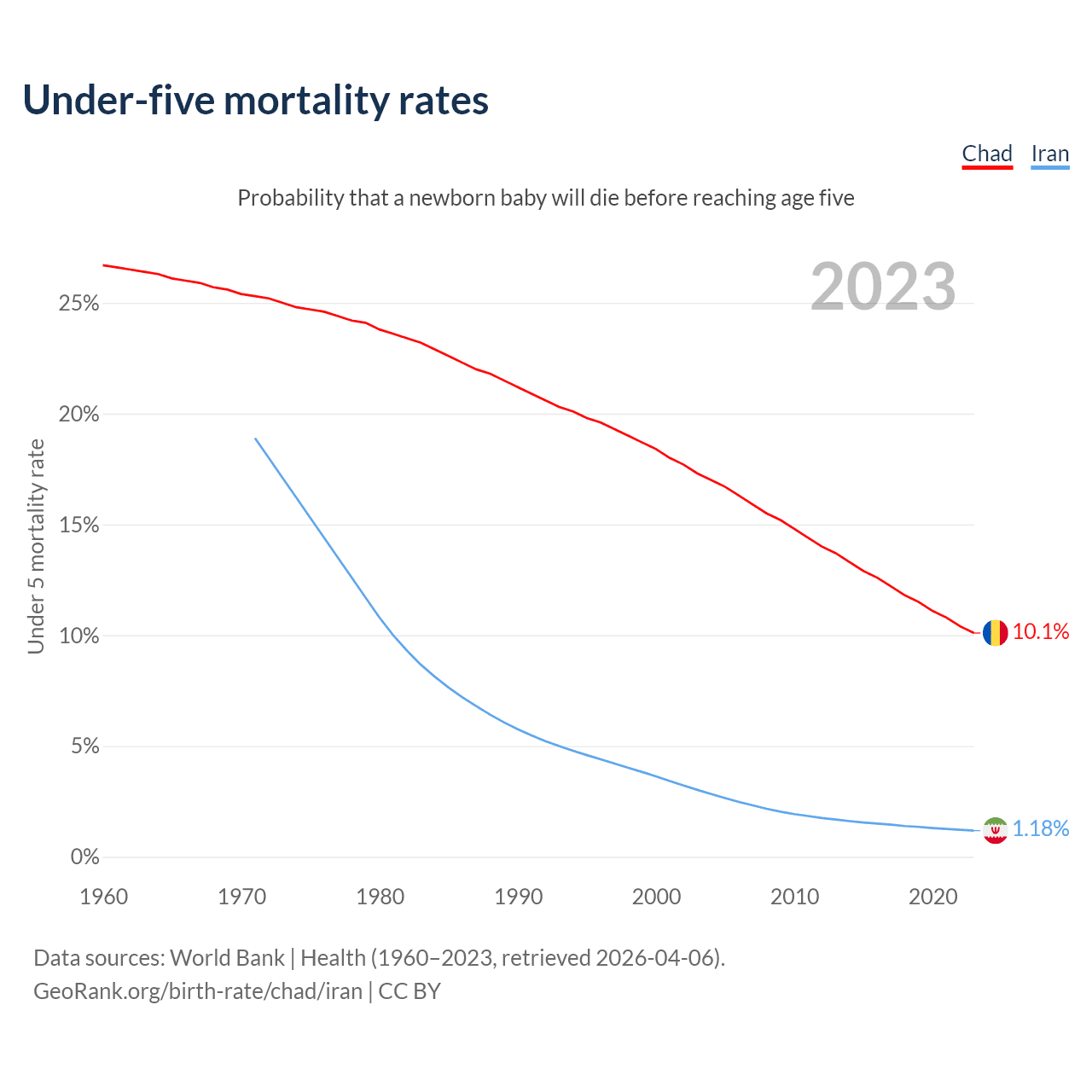 The chance that a newborn baby will die before reaching age five is 10.1% in Chad and 1.18% in Iran. Above is a chart with historical data on under-five mortality rates.