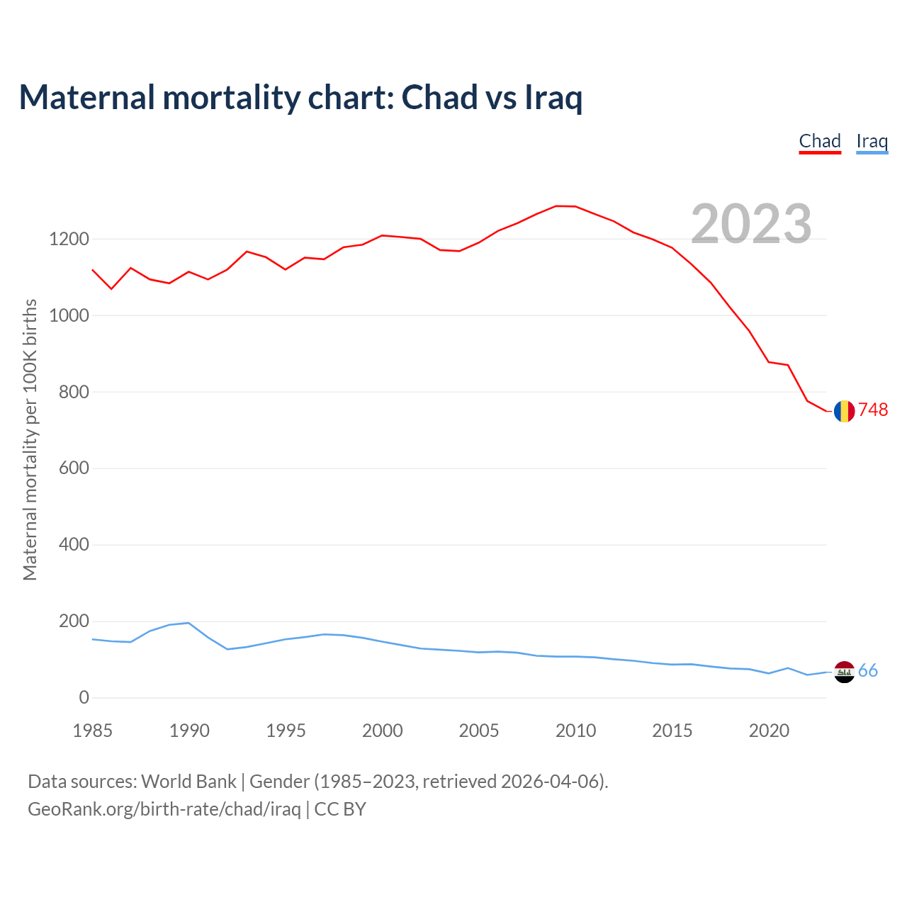 The maternal mortality rate, which is the probability of dying during childbirth or within 42 days of pregnancy termination, is 748 deaths per 100,000 live births in Chad, compared to 66 deaths in Iraq.