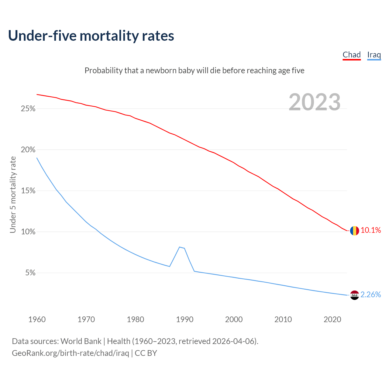 The chance that a newborn baby will die before reaching age five is 10.1% in Chad and 2.26% in Iraq. Above is a chart with historical data on under-five mortality rates.