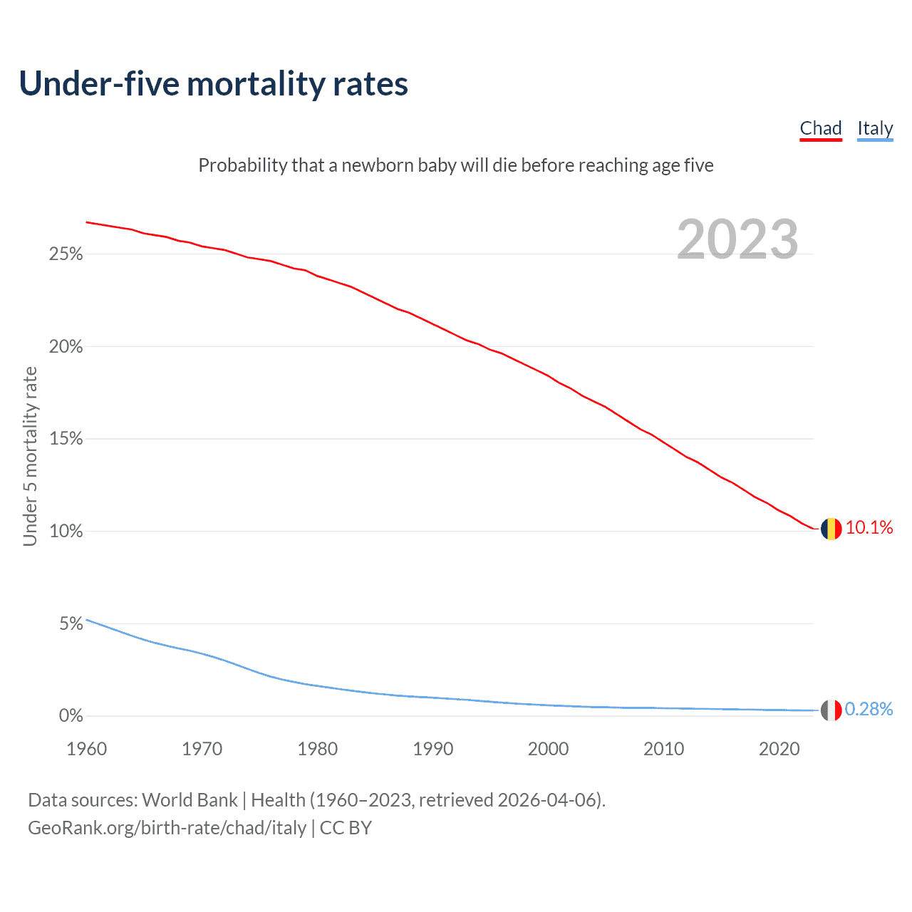 The chance that a newborn baby will die before reaching age five is 10.1% in Chad and 0.28% in Italy. Above is a chart with historical data on under-five mortality rates.