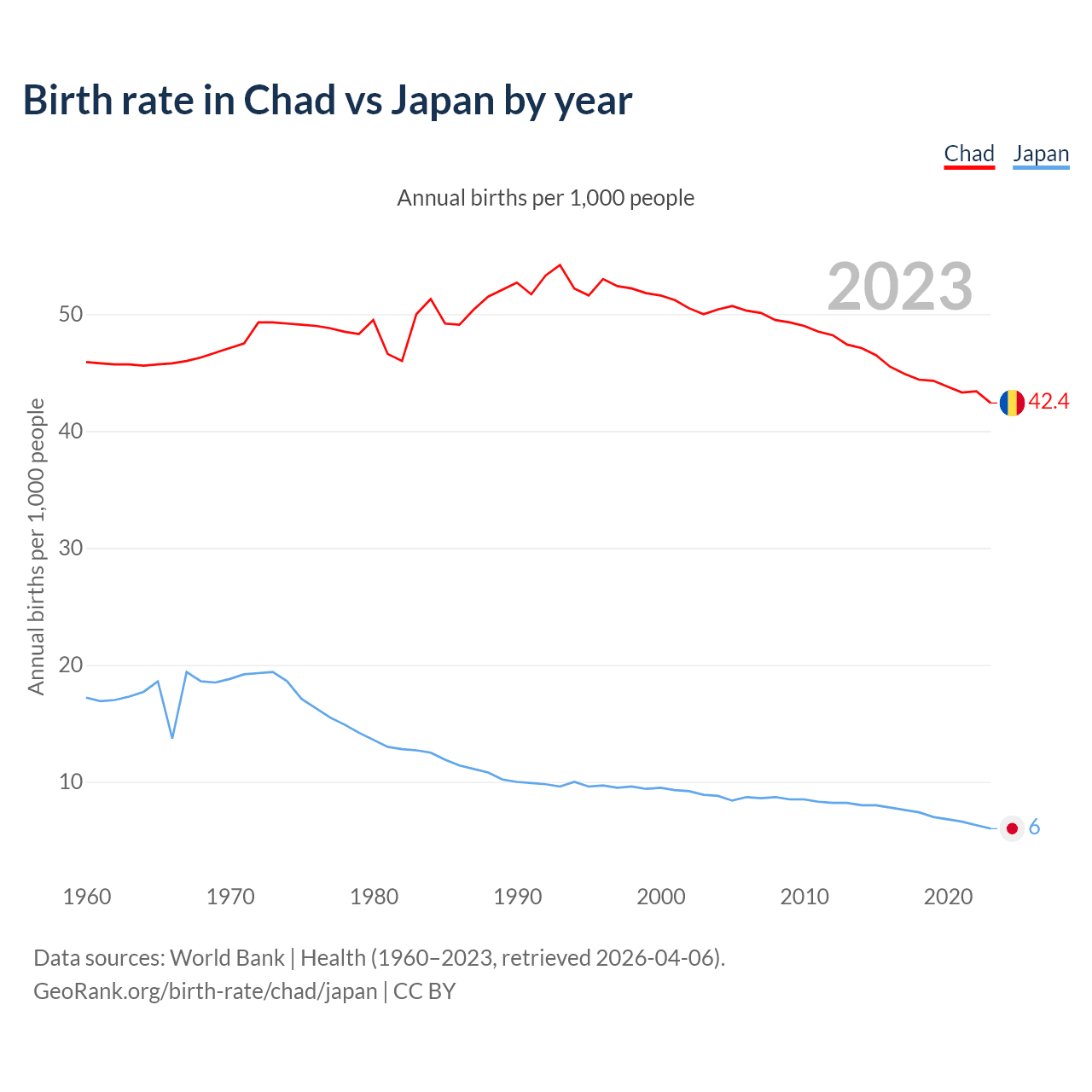 Chad has an annual birth rate of 42.4 births per 1,000 people, compared to 6 for Japan. The average number of children a woman is expected to have during her lifetime — the fertility rate, is 6.12 in Chad and 1.2 in Japan — 80.4% difference.