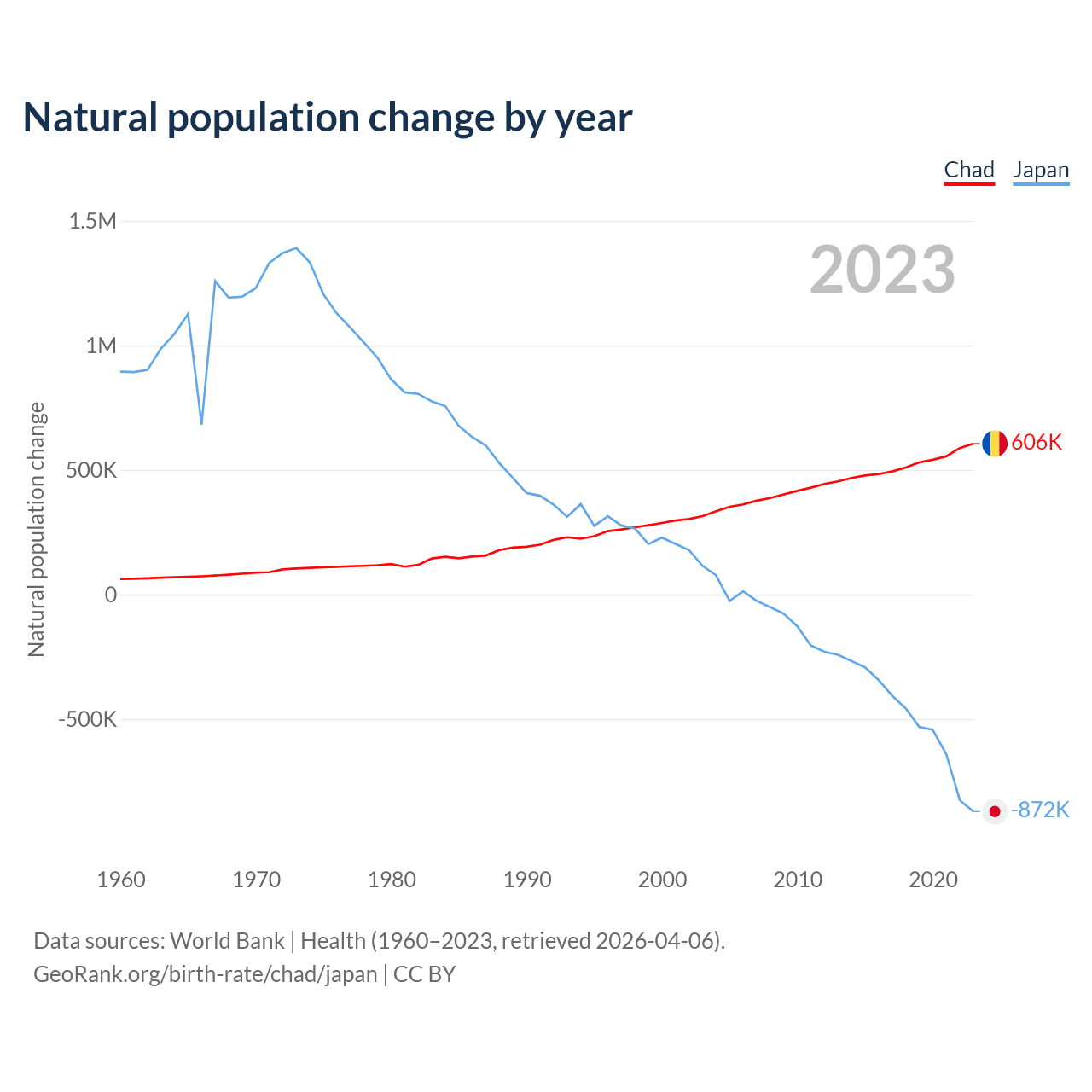 According to the latest available data on birth rates, the fertility rate in Chad was 6.12 children per woman in 2023, compared to 1.2 in Japan in 2023. The replacement level is considered to be 2.1 children per woman.