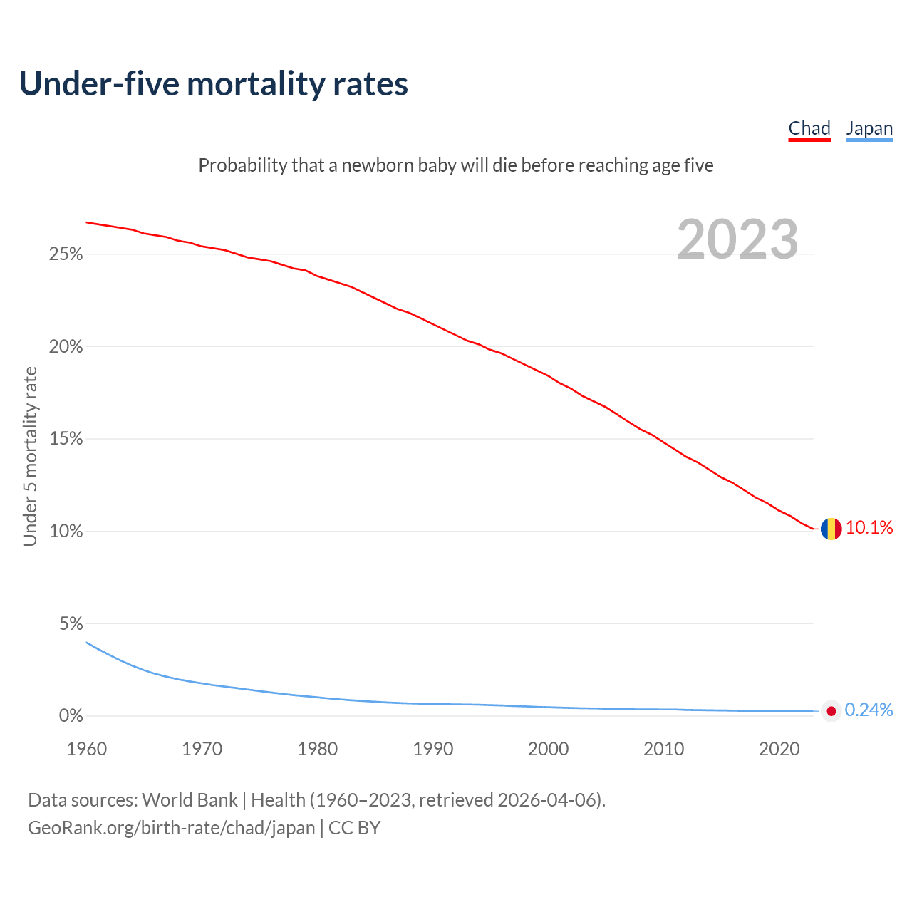 The chance that a newborn baby will die before reaching age five is 10.1% in Chad and 0.24% in Japan. Above is a chart with historical data on under-five mortality rates.