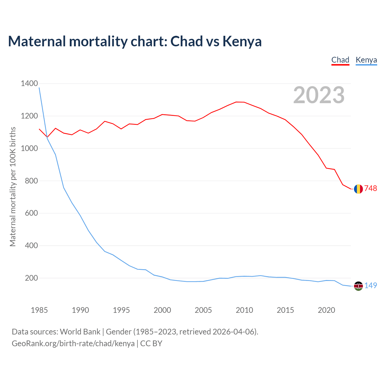 The maternal mortality rate, which is the probability of dying during childbirth or within 42 days of pregnancy termination, is 748 deaths per 100,000 live births in Chad, compared to 149 deaths in Kenya.