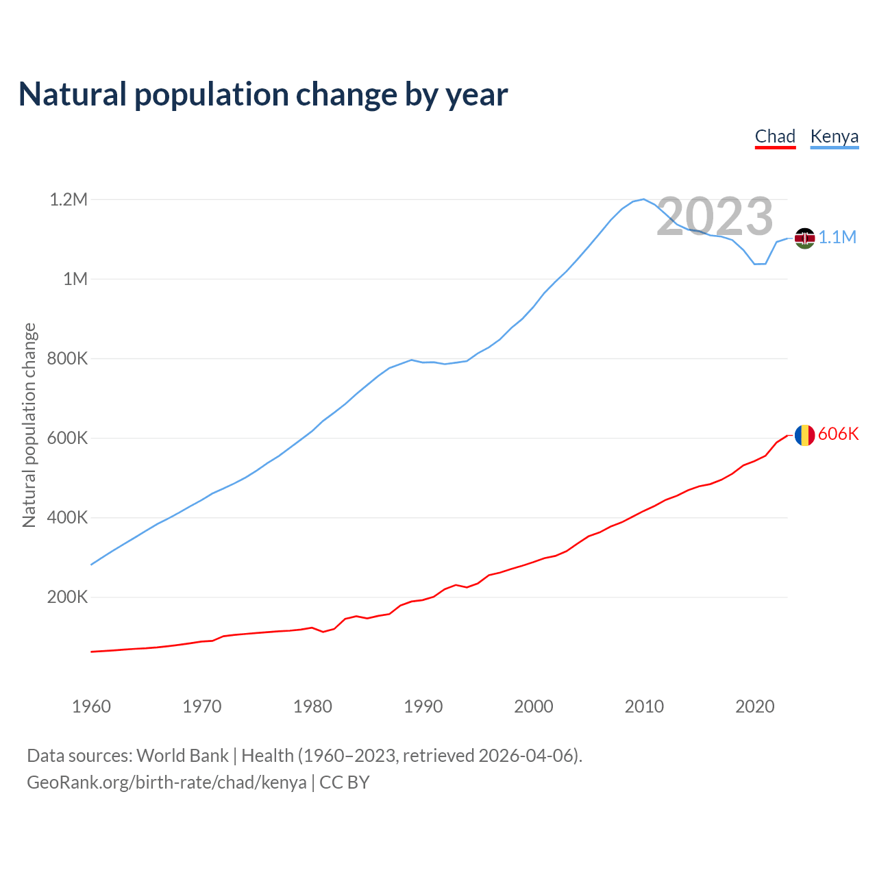 Chad has an annual birth rate of 42.4 births per 1,000 people, compared to 27.1 for Kenya. The average number of children a woman is expected to have during her lifetime — the fertility rate, is 6.12 in Chad and 3.21 in Kenya — 47.6% difference.