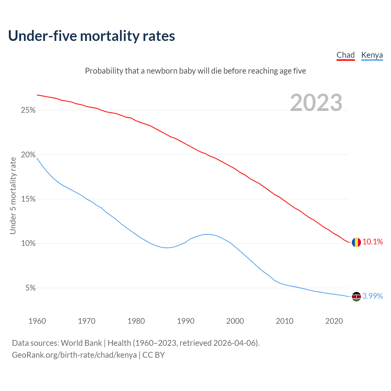The chance that a newborn baby will die before reaching age five is 10.1% in Chad and 3.99% in Kenya. Above is a chart with historical data on under-five mortality rates.