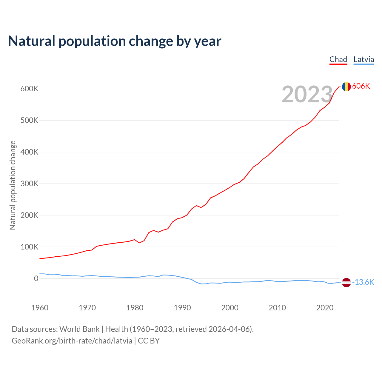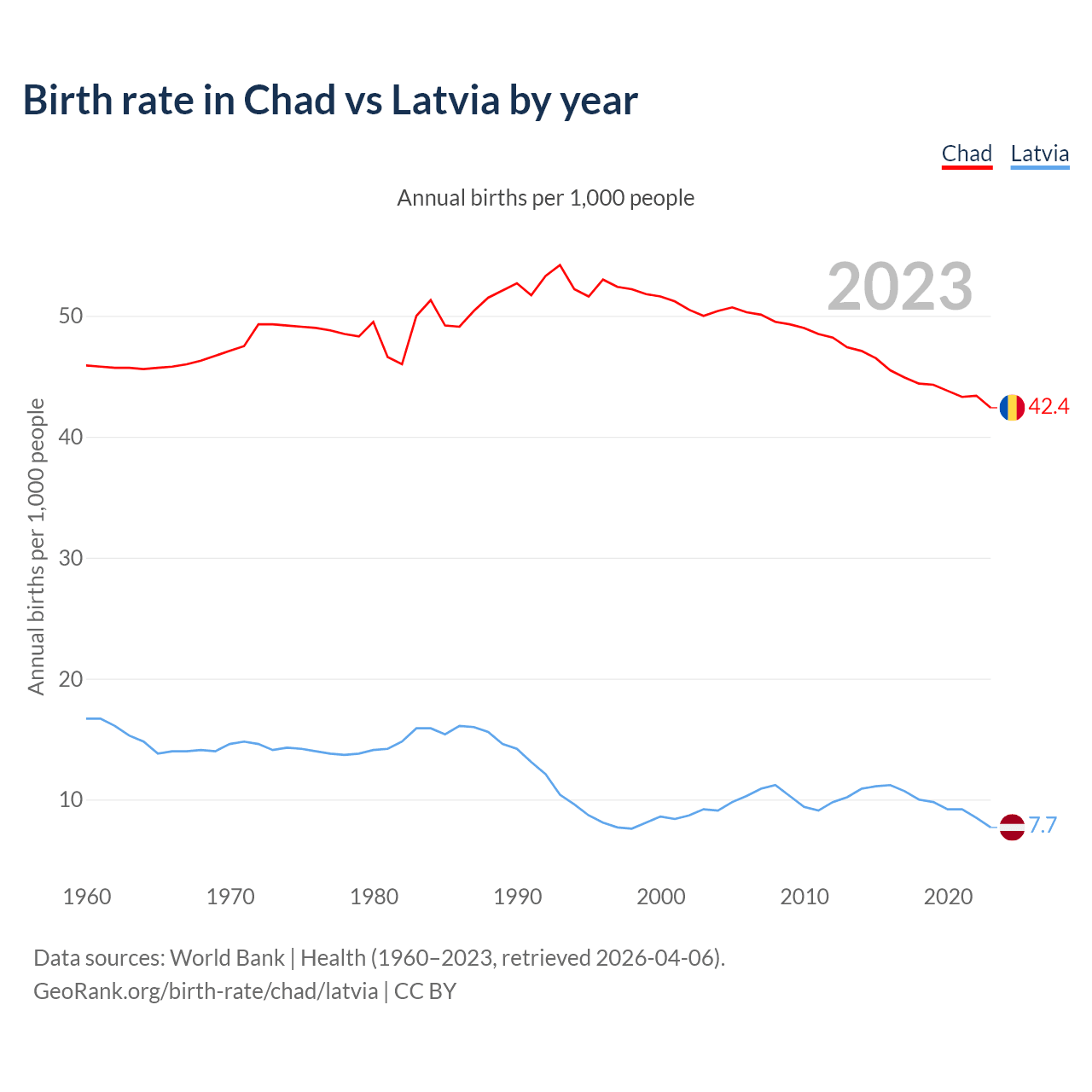 Chad has an annual birth rate of 42.4 births per 1,000 people, compared to 7.7 for Latvia. The average number of children a woman is expected to have during her lifetime — the fertility rate, is 6.12 in Chad and 1.36 in Latvia — 77.8% difference.