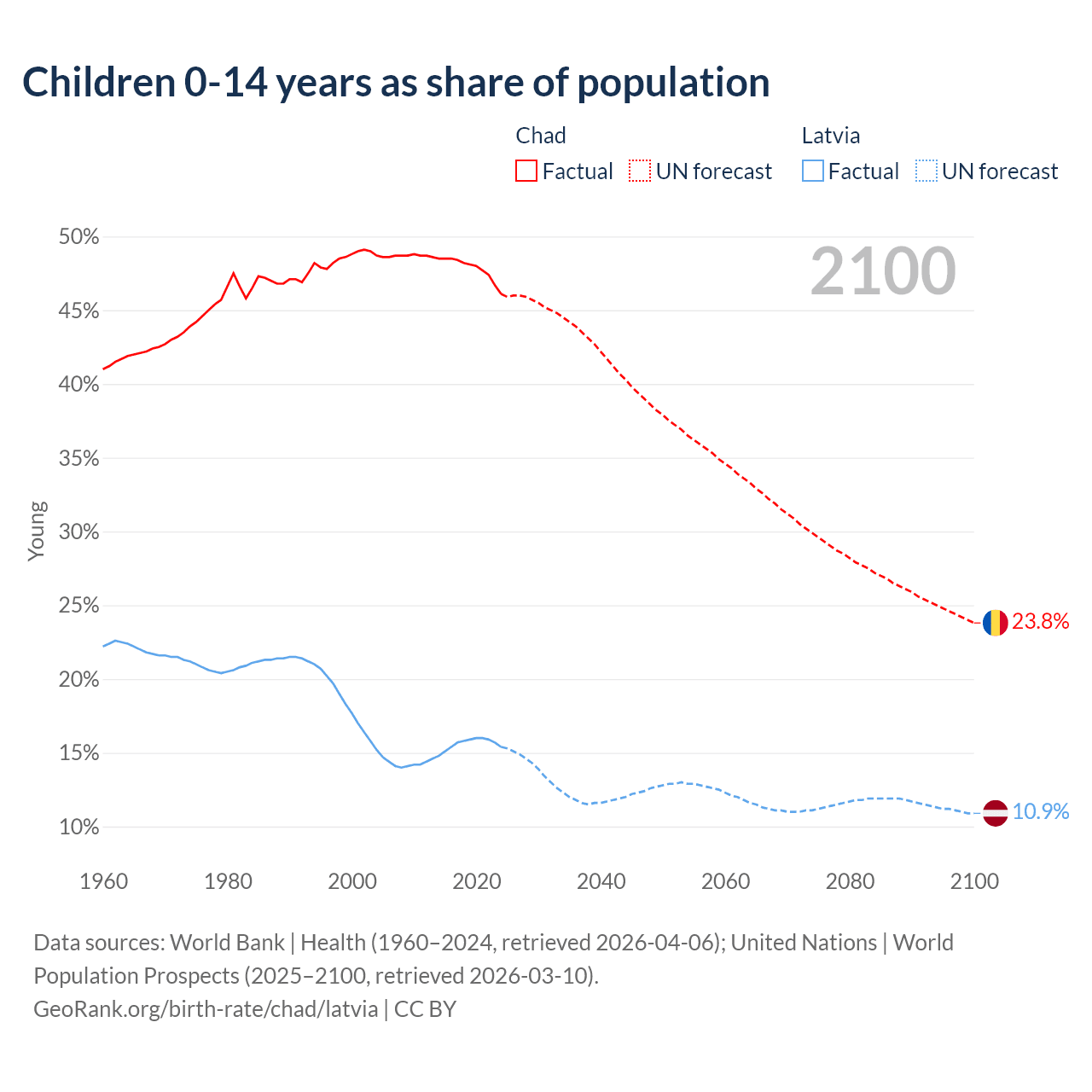 According to the latest available data on birth rates, the fertility rate in Chad was 6.12 children per woman in 2023, compared to 1.36 in Latvia in 2023. The replacement level is considered to be 2.1 children per woman.