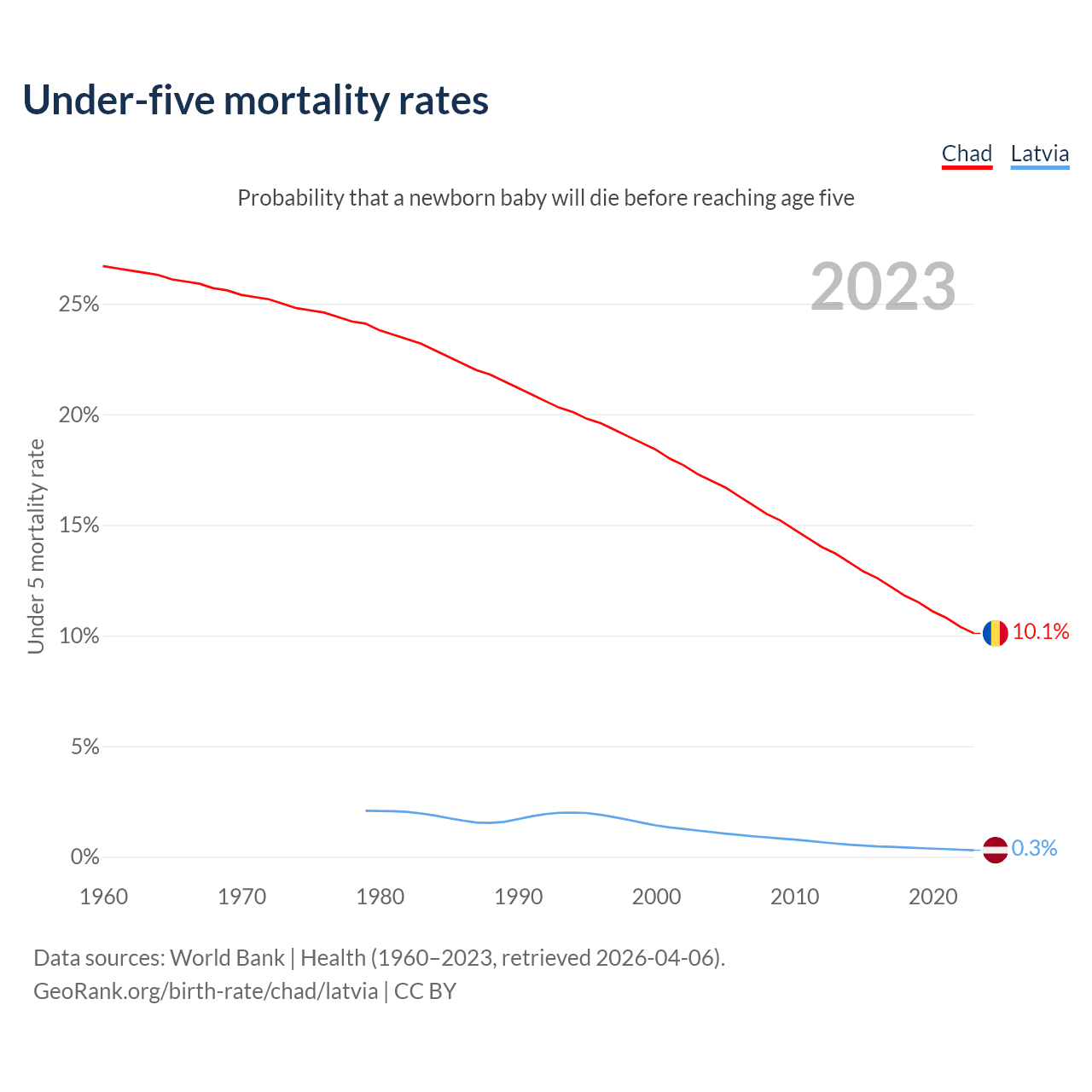 The chance that a newborn baby will die before reaching age five is 10.1% in Chad and 0.3% in Latvia. Above is a chart with historical data on under-five mortality rates.