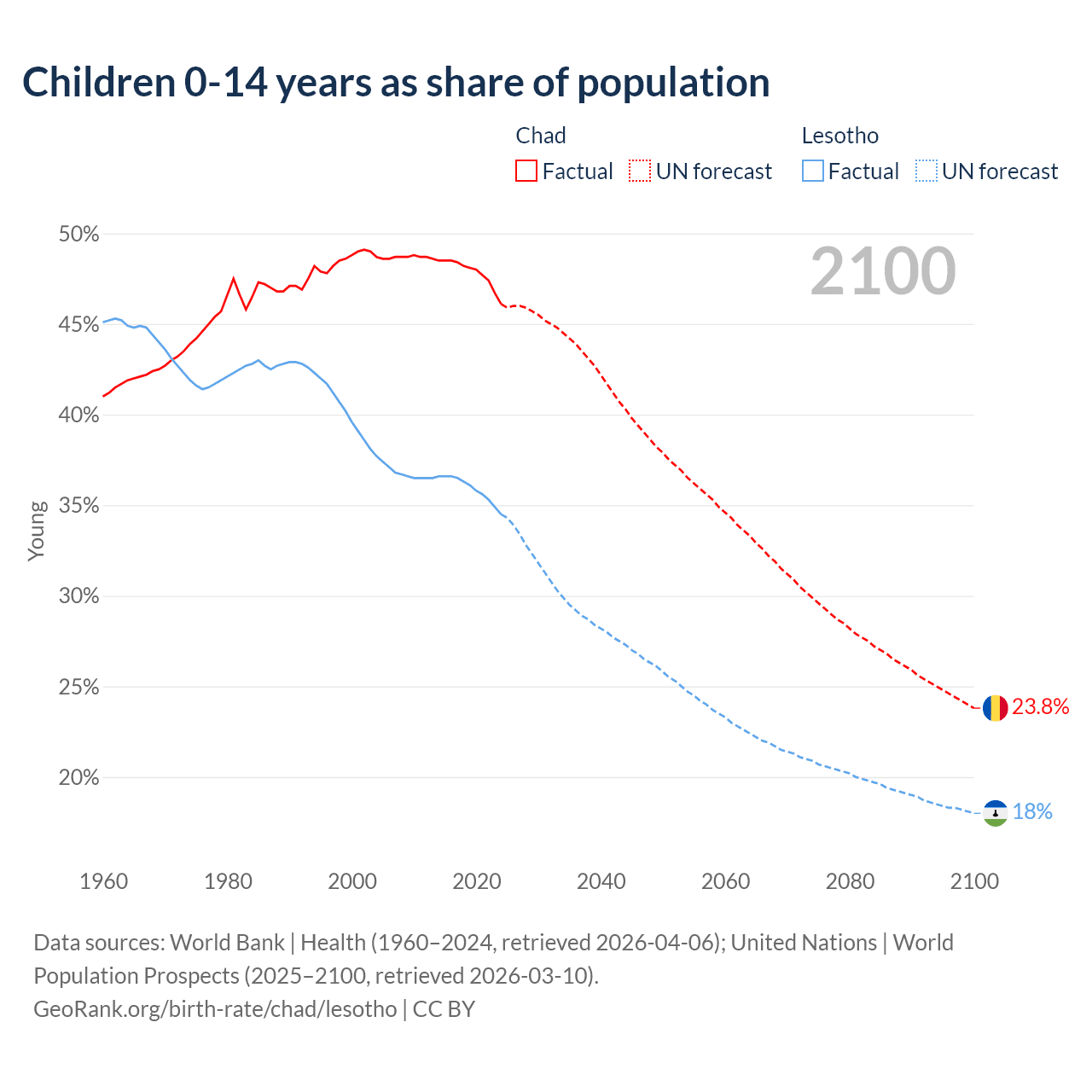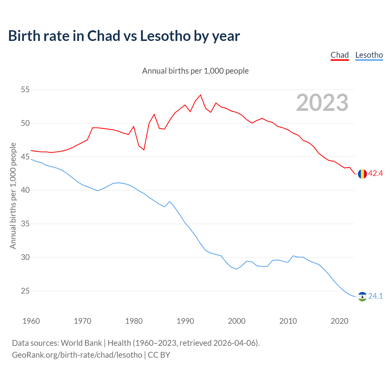 Chad has an annual birth rate of 42.4 births per 1,000 people, compared to 24.1 for Lesotho. The average number of children a woman is expected to have during her lifetime — the fertility rate, is 6.12 in Chad and 2.69 in Lesotho — 56% difference.