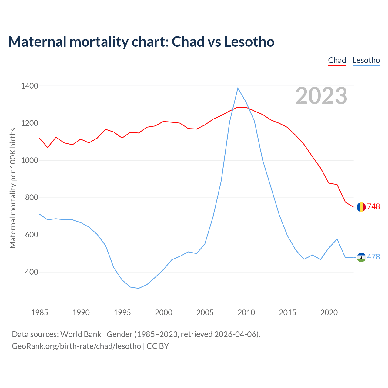 The maternal mortality rate, which is the probability of dying during childbirth or within 42 days of pregnancy termination, is 748 deaths per 100,000 live births in Chad, compared to 478 deaths in Lesotho.