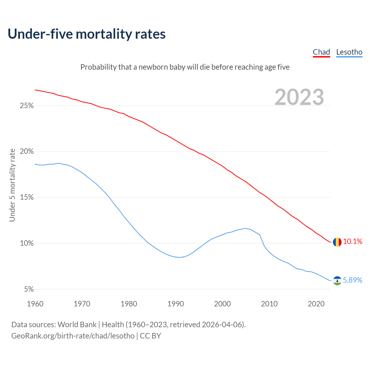 The chance that a newborn baby will die before reaching age five is 10.1% in Chad and 5.89% in Lesotho. Above is a chart with historical data on under-five mortality rates.