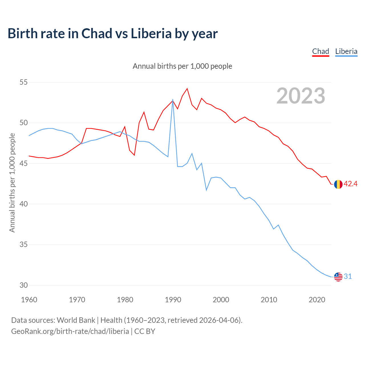 Chad has an annual birth rate of 42.4 births per 1,000 people, compared to 31 for Liberia. The average number of children a woman is expected to have during her lifetime — the fertility rate, is 6.12 in Chad and 3.95 in Liberia — 35.5% difference.