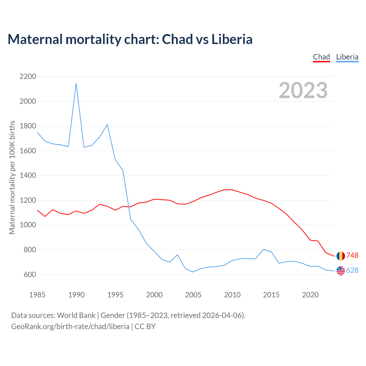 The maternal mortality rate, which is the probability of dying during childbirth or within 42 days of pregnancy termination, is 748 deaths per 100,000 live births in Chad, compared to 628 deaths in Liberia.