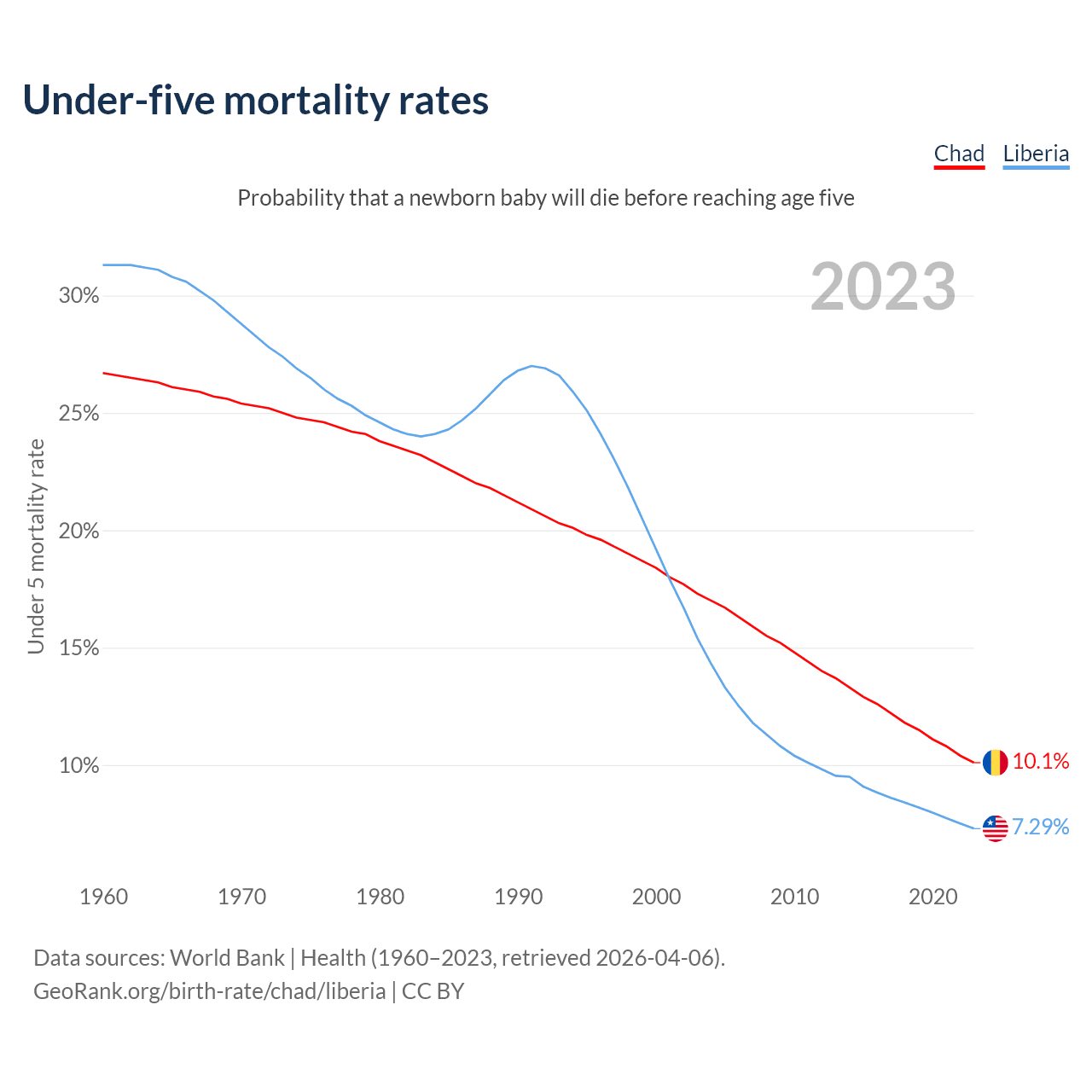 The chance that a newborn baby will die before reaching age five is 10.1% in Chad and 7.29% in Liberia. Above is a chart with historical data on under-five mortality rates.