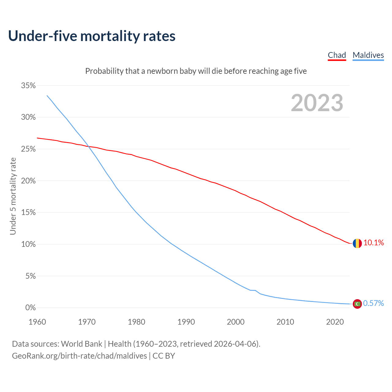 The chance that a newborn baby will die before reaching age five is 10.1% in Chad and 0.57% in Maldives. Above is a chart with historical data on under-five mortality rates.