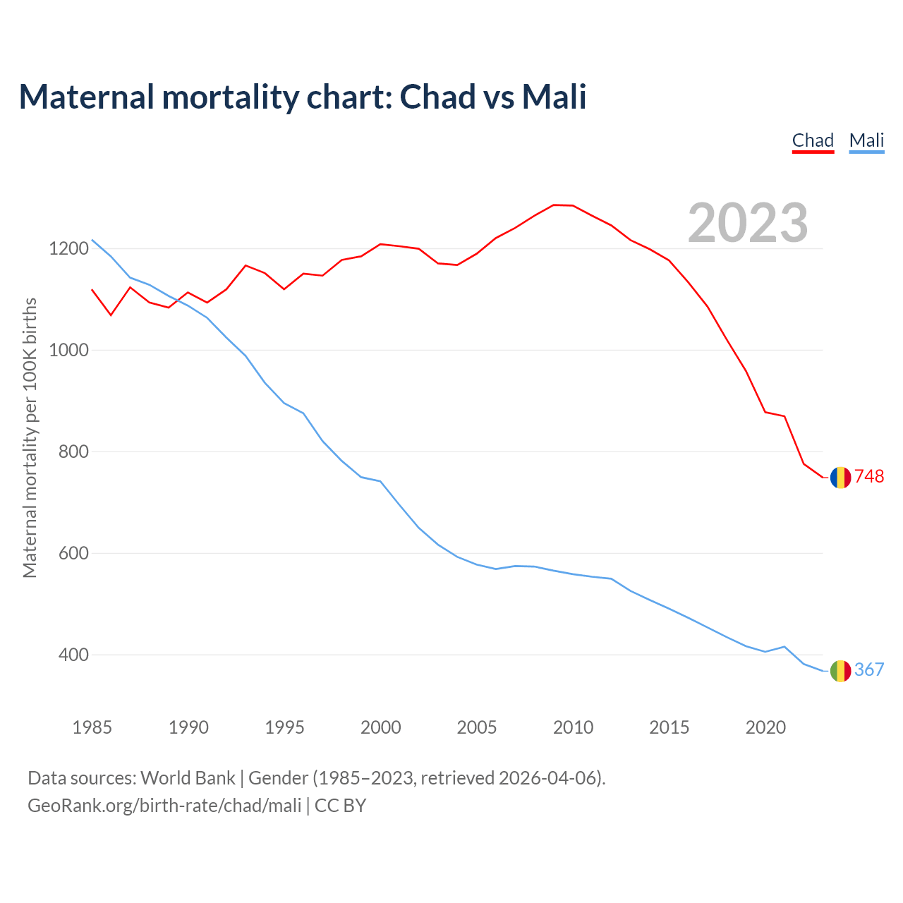 The maternal mortality rate, which is the probability of dying during childbirth or within 42 days of pregnancy termination, is 748 deaths per 100,000 live births in Chad, compared to 367 deaths in Mali.
