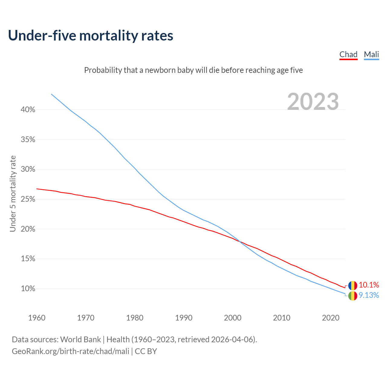 The chance that a newborn baby will die before reaching age five is 10.1% in Chad and 9.13% in Mali. Above is a chart with historical data on under-five mortality rates.