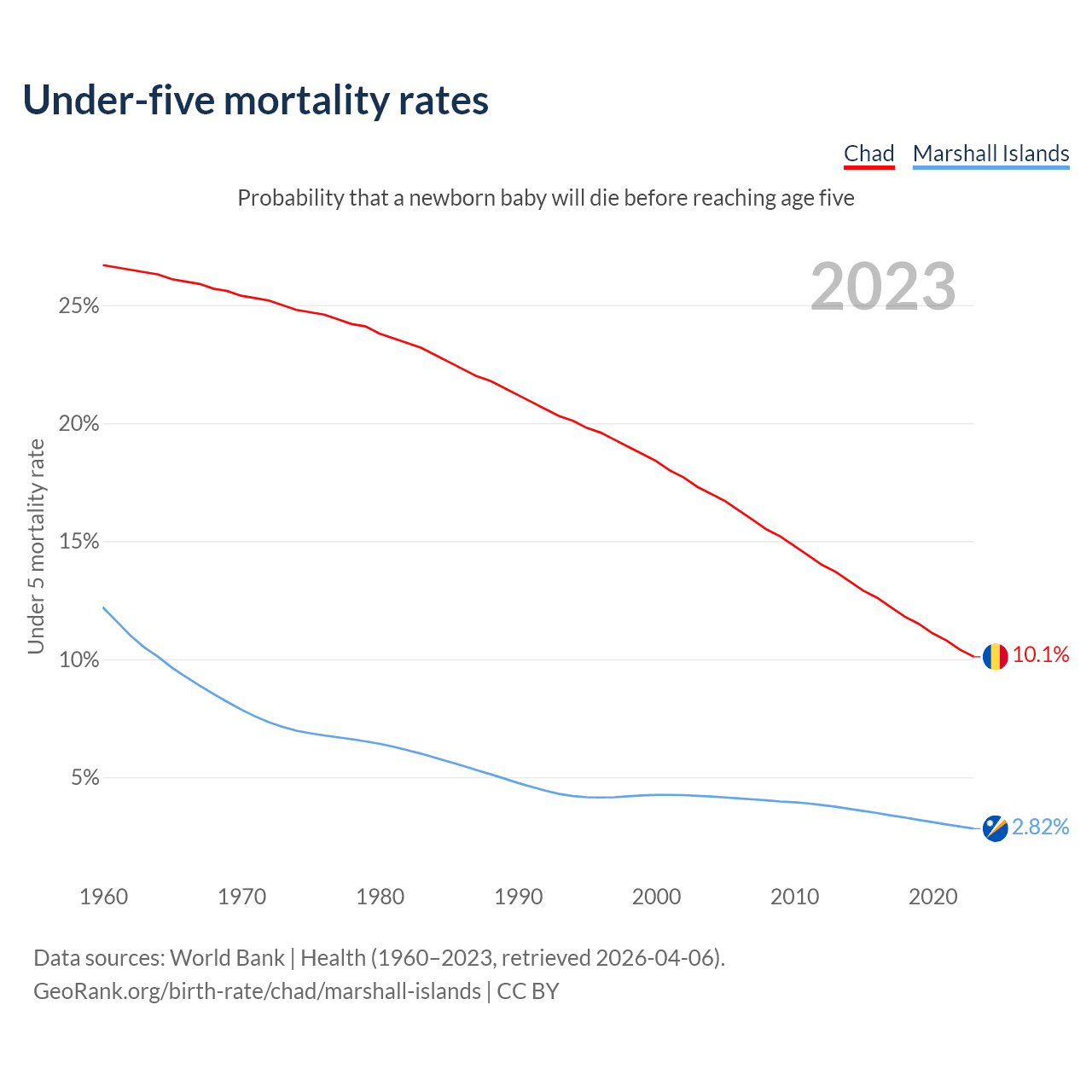 The chance that a newborn baby will die before reaching age five is 10.1% in Chad and 2.82% in the Marshall Islands. Above is a chart with historical data on under-five mortality rates.
