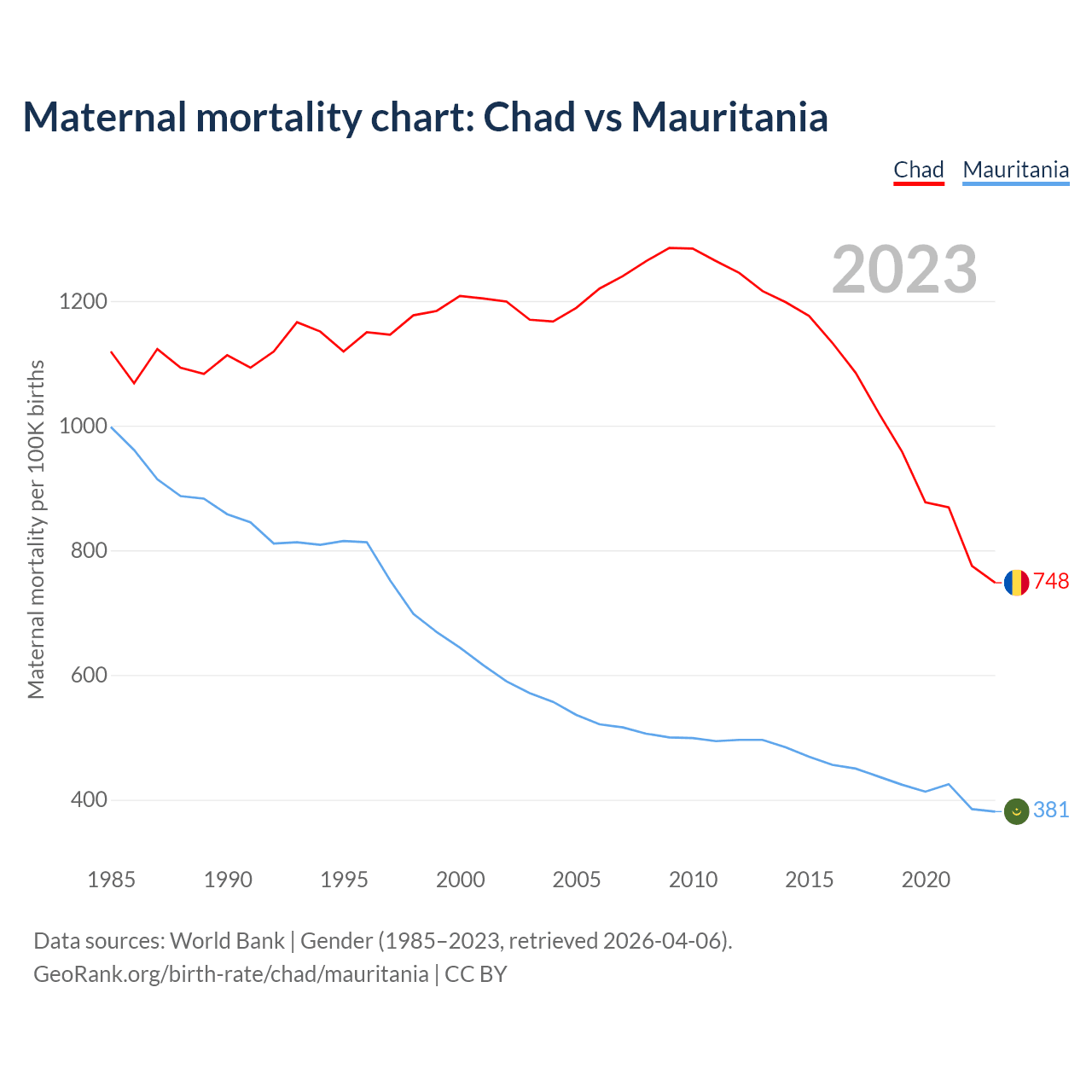 The maternal mortality rate, which is the probability of dying during childbirth or within 42 days of pregnancy termination, is 748 deaths per 100,000 live births in Chad, compared to 381 deaths in Mauritania.