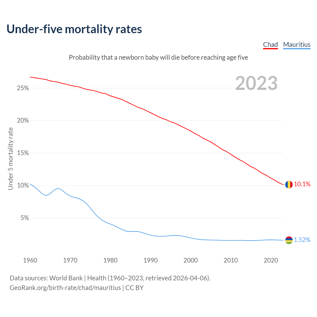The chance that a newborn baby will die before reaching age five is 10.1% in Chad and 1.52% in Mauritius. Above is a chart with historical data on under-five mortality rates.
