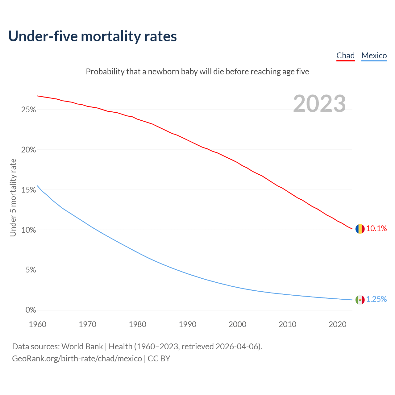 The chance that a newborn baby will die before reaching age five is 10.1% in Chad and 1.25% in Mexico. Above is a chart with historical data on under-five mortality rates.