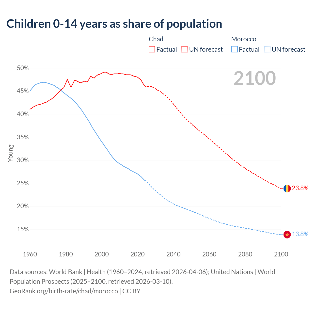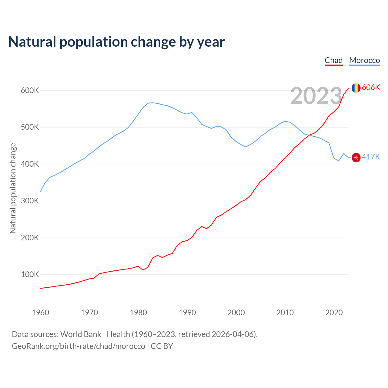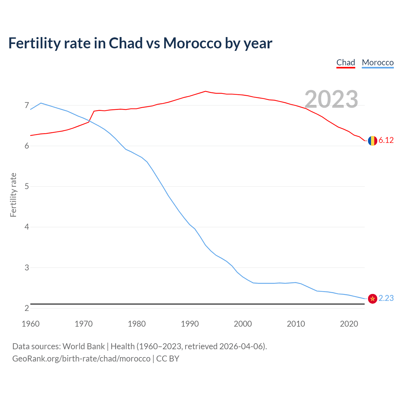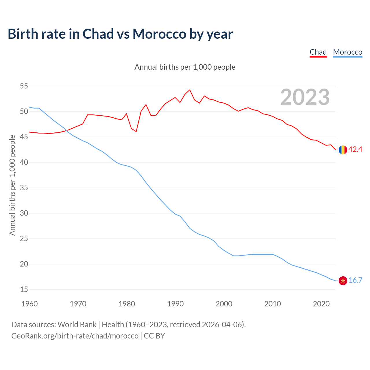 Chad has an annual birth rate of 42.4 births per 1,000 people, compared to 16.7 for Morocco. The average number of children a woman is expected to have during her lifetime — the fertility rate, is 6.12 in Chad and 2.23 in Morocco — 63.6% difference.