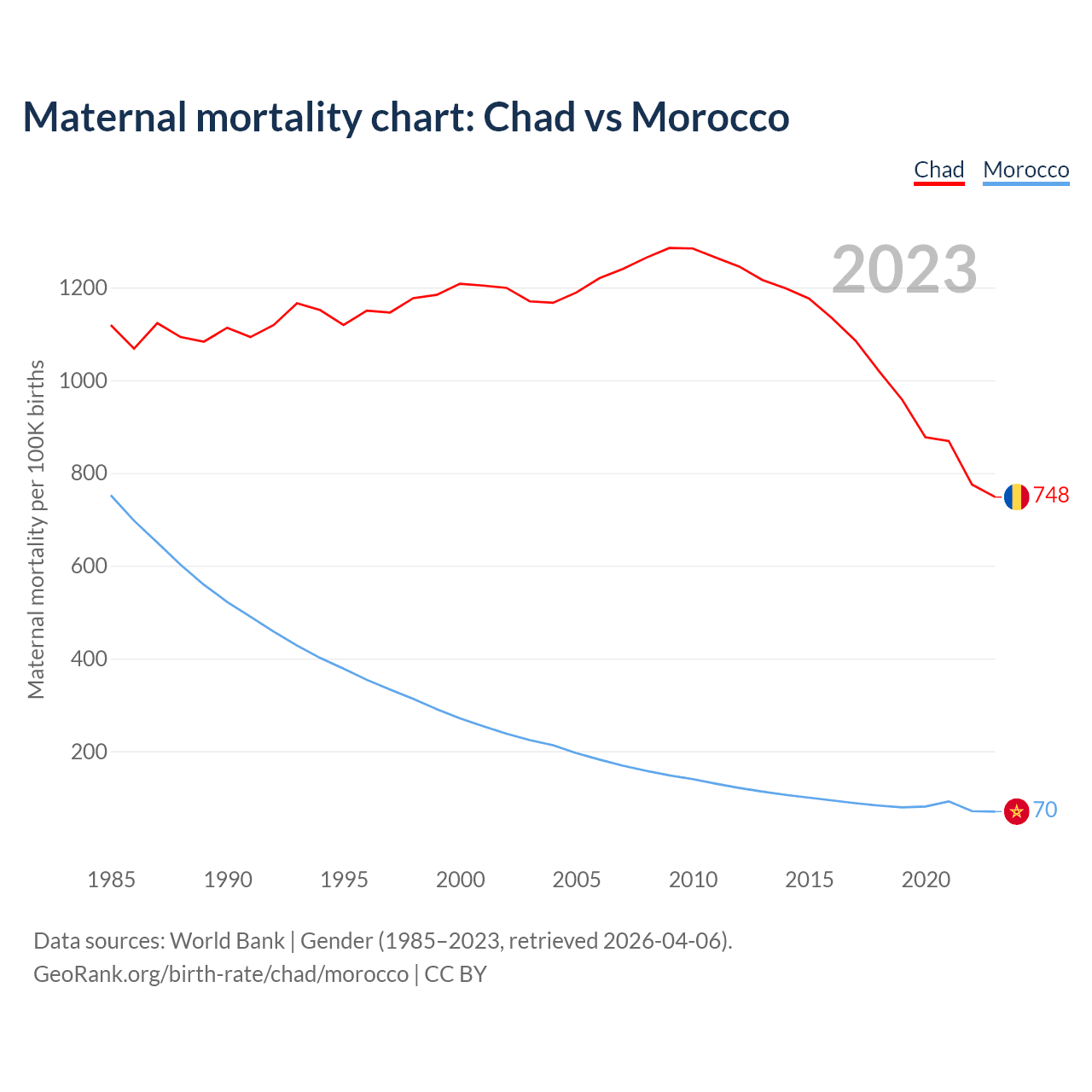 The maternal mortality rate, which is the probability of dying during childbirth or within 42 days of pregnancy termination, is 748 deaths per 100,000 live births in Chad, compared to 70 deaths in Morocco.