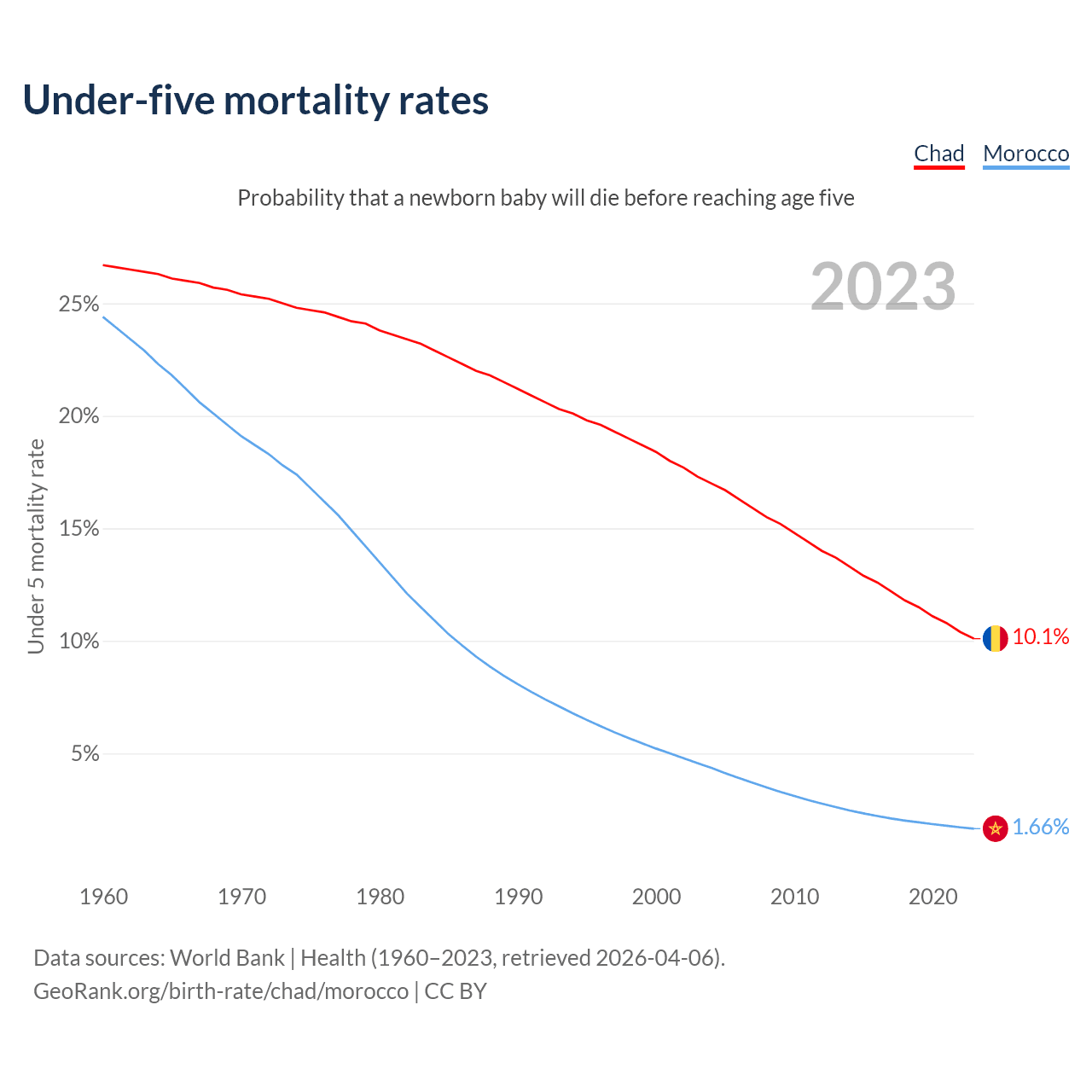 The chance that a newborn baby will die before reaching age five is 10.1% in Chad and 1.66% in Morocco. Above is a chart with historical data on under-five mortality rates.