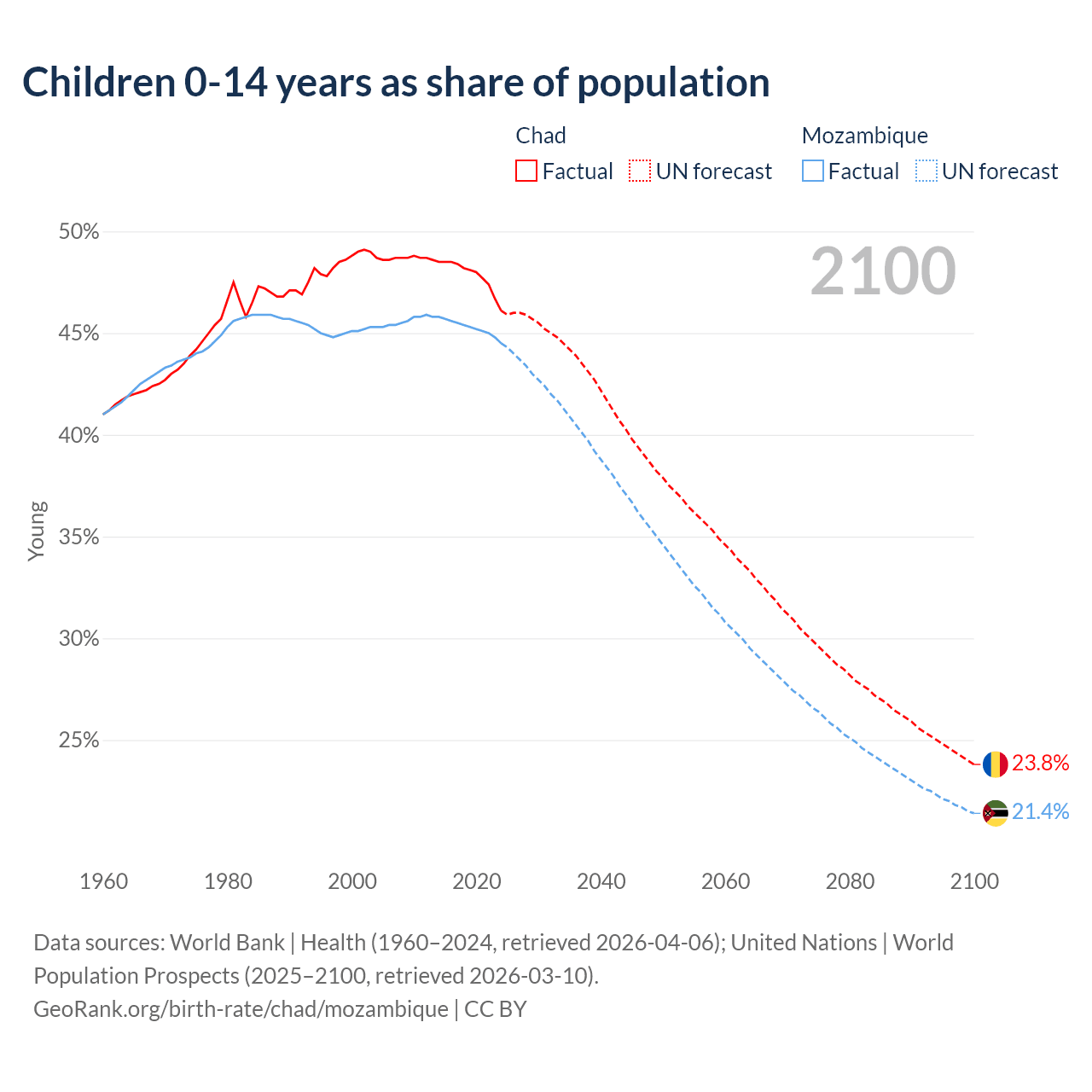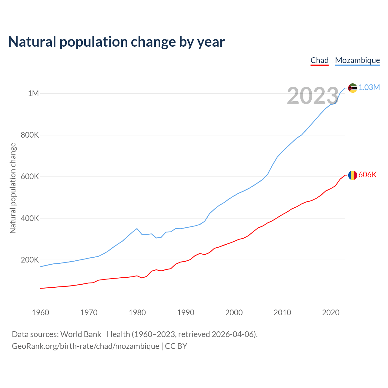 According to the latest available data on birth rates, the fertility rate in Chad was 6.12 children per woman in 2023, compared to 4.76 in Mozambique in 2023. The replacement level is considered to be 2.1 children per woman.