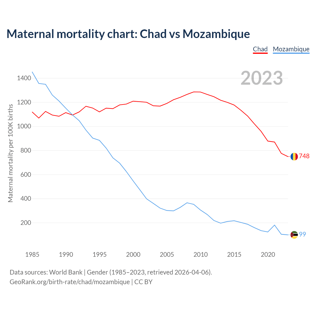 The maternal mortality rate, which is the probability of dying during childbirth or within 42 days of pregnancy termination, is 748 deaths per 100,000 live births in Chad, compared to 99 deaths in Mozambique.