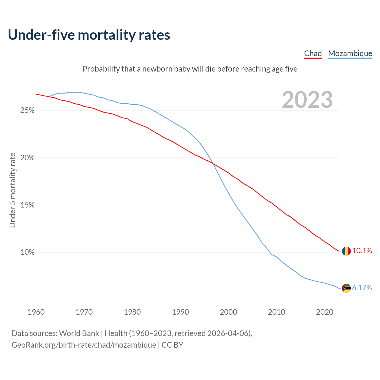The chance that a newborn baby will die before reaching age five is 10.1% in Chad and 6.17% in Mozambique. Above is a chart with historical data on under-five mortality rates.