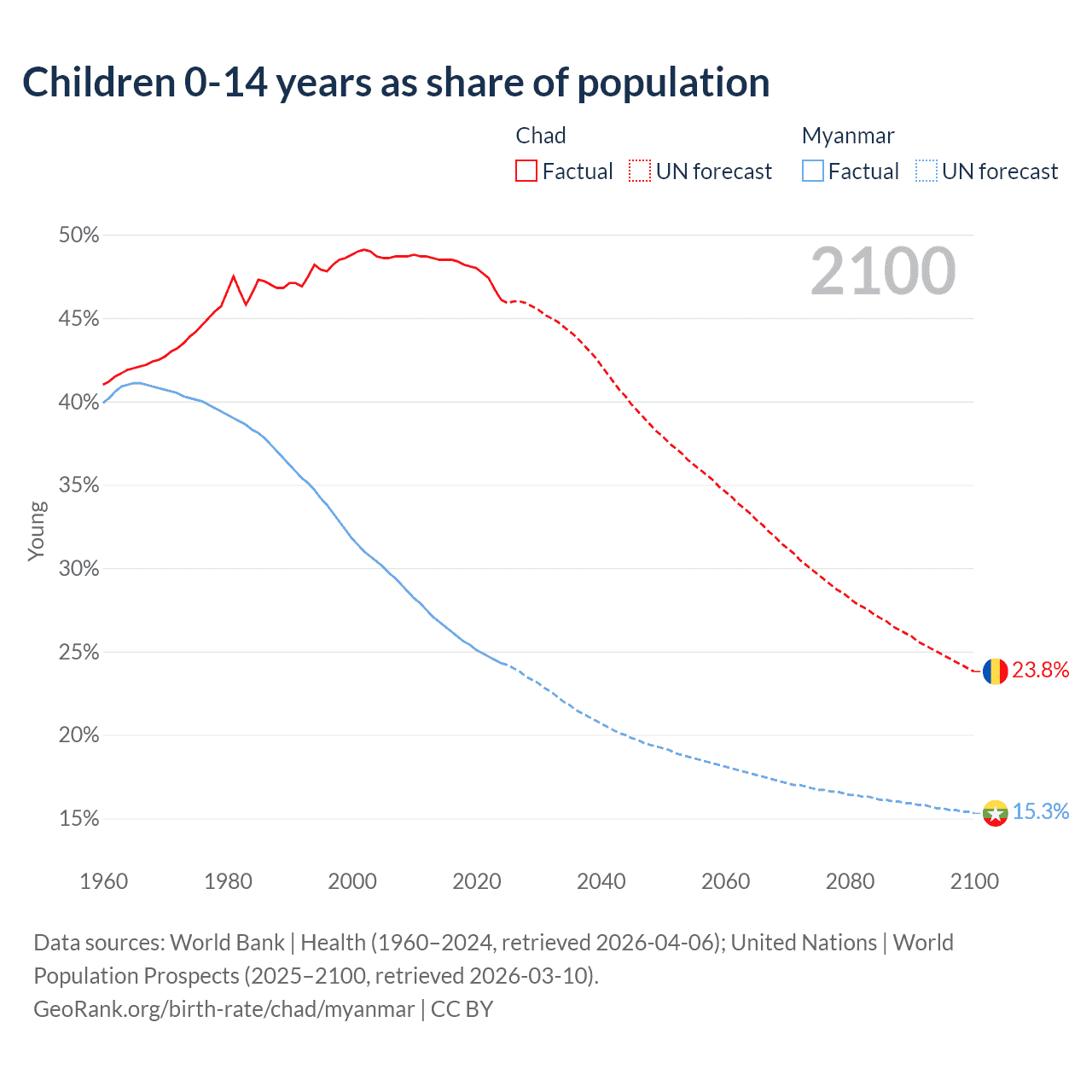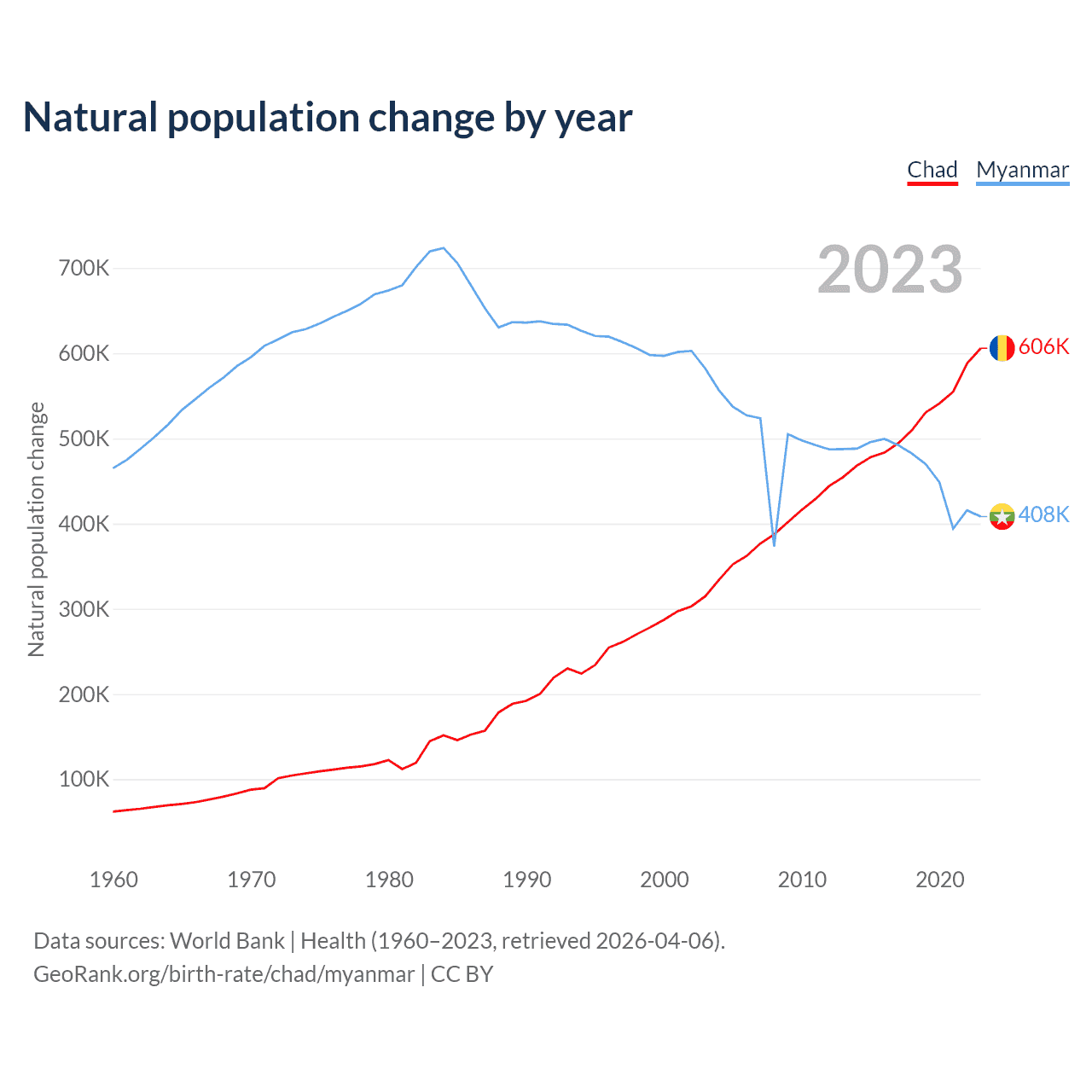 Chad has an annual birth rate of 42.4 births per 1,000 people, compared to 16.7 for Myanmar. The average number of children a woman is expected to have during her lifetime — the fertility rate, is 6.12 in Chad and 2.12 in Myanmar — 65.4% difference.