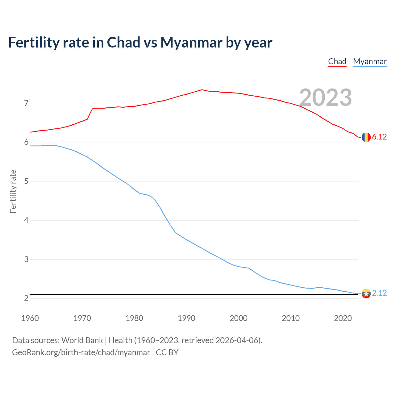 According to the latest available data on birth rates, the fertility rate in Chad was 6.12 children per woman in 2023, compared to 2.12 in Myanmar in 2023. The replacement level is considered to be 2.1 children per woman.