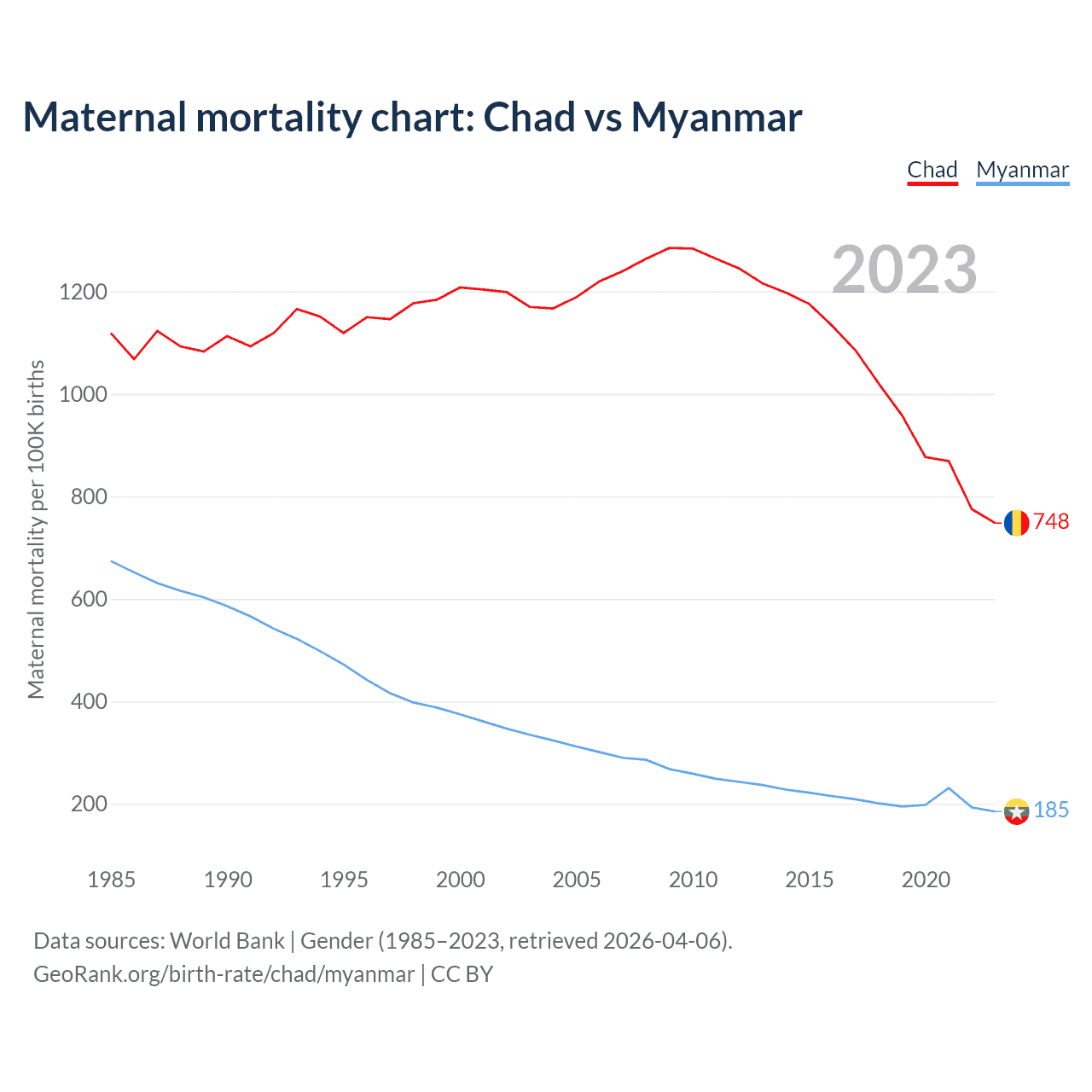 The maternal mortality rate, which is the probability of dying during childbirth or within 42 days of pregnancy termination, is 748 deaths per 100,000 live births in Chad, compared to 185 deaths in Myanmar.