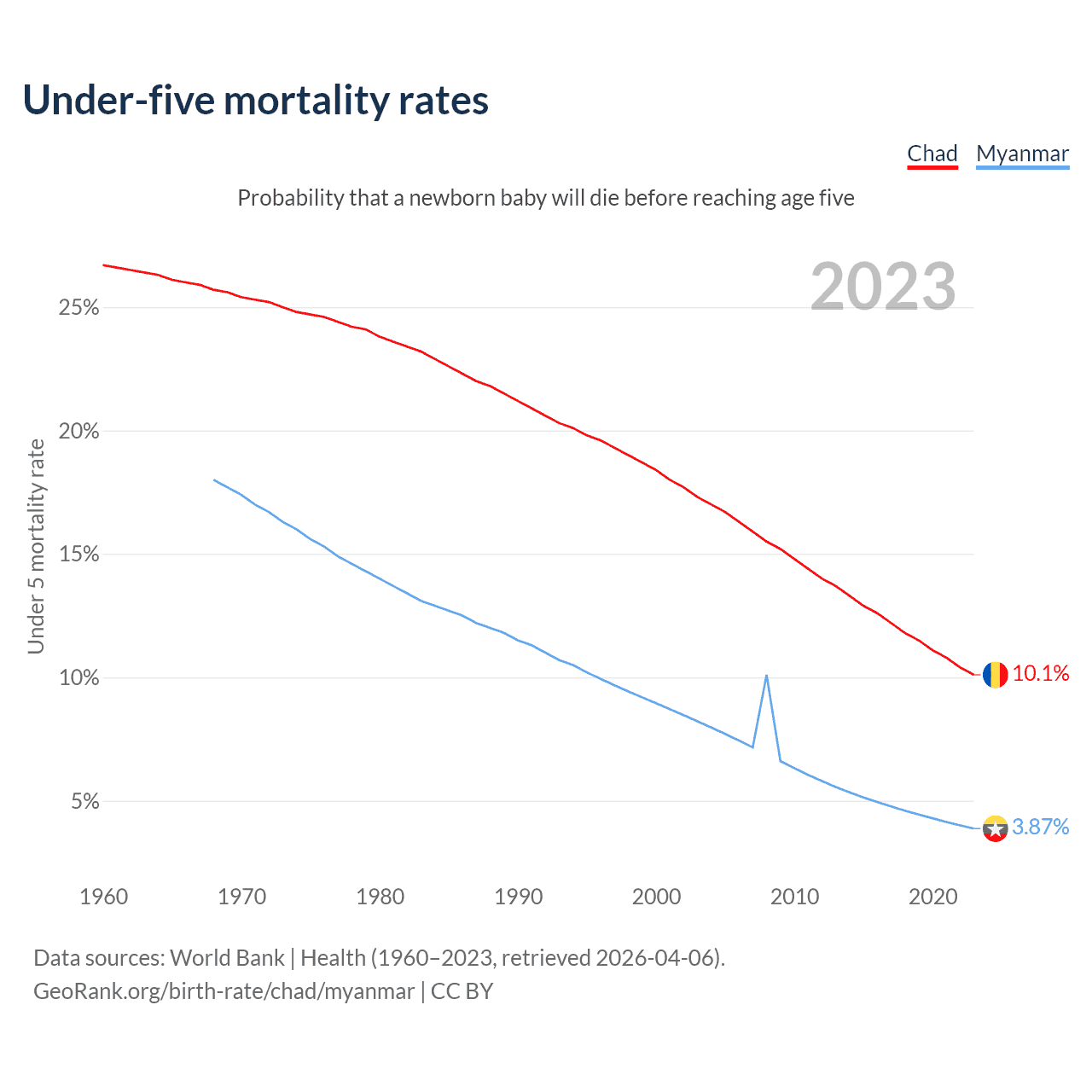 The chance that a newborn baby will die before reaching age five is 10.1% in Chad and 3.87% in Myanmar. Above is a chart with historical data on under-five mortality rates.