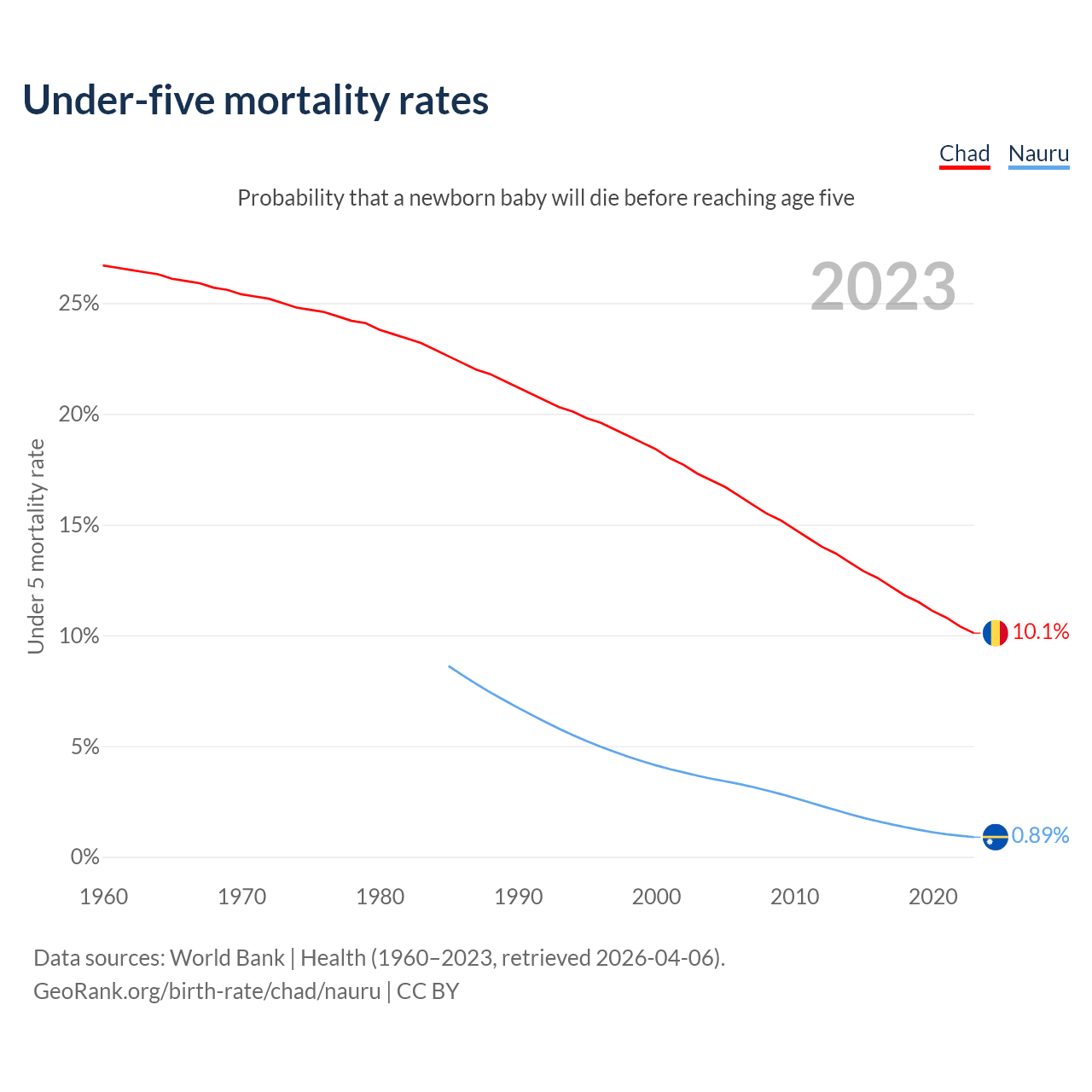 The chance that a newborn baby will die before reaching age five is 10.1% in Chad and 0.89% in Nauru. Above is a chart with historical data on under-five mortality rates.