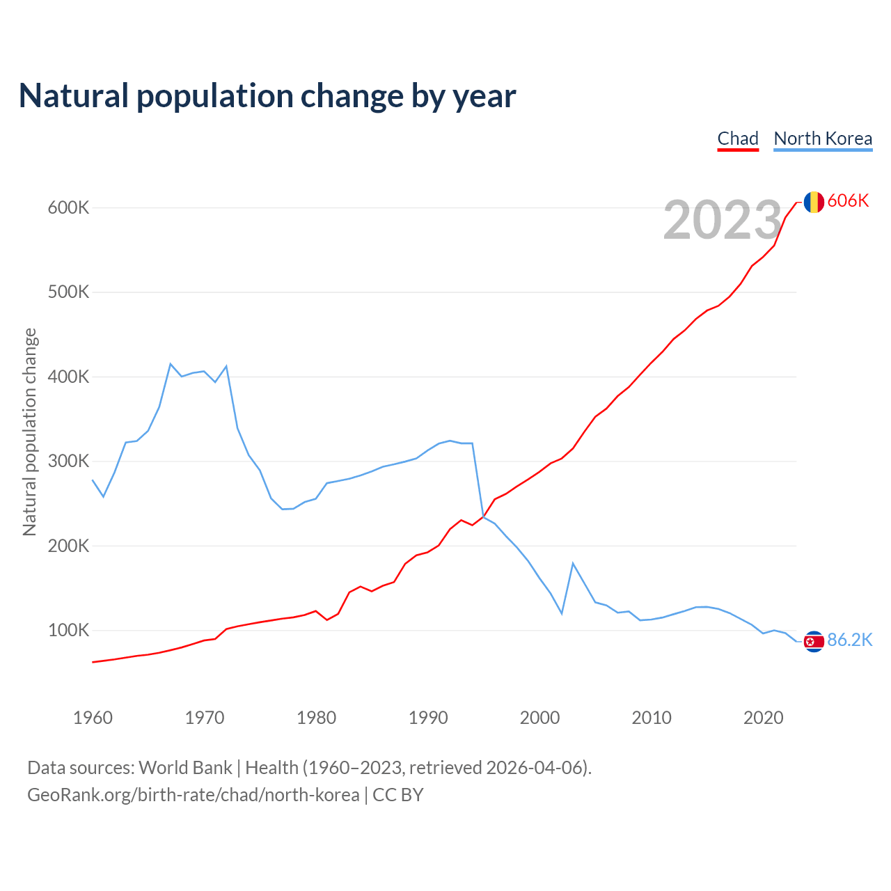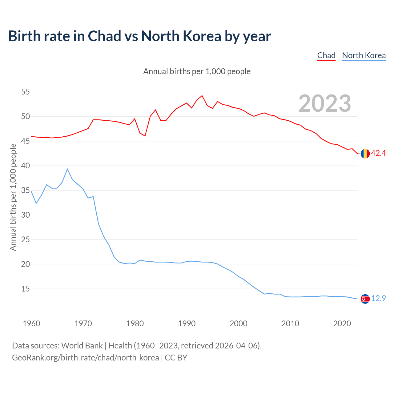 Chad has an annual birth rate of 42.4 births per 1,000 people, compared to 12.9 for North Korea. The average number of children a woman is expected to have during her lifetime — the fertility rate, is 6.12 in Chad and 1.78 in North Korea — 70.9% difference.