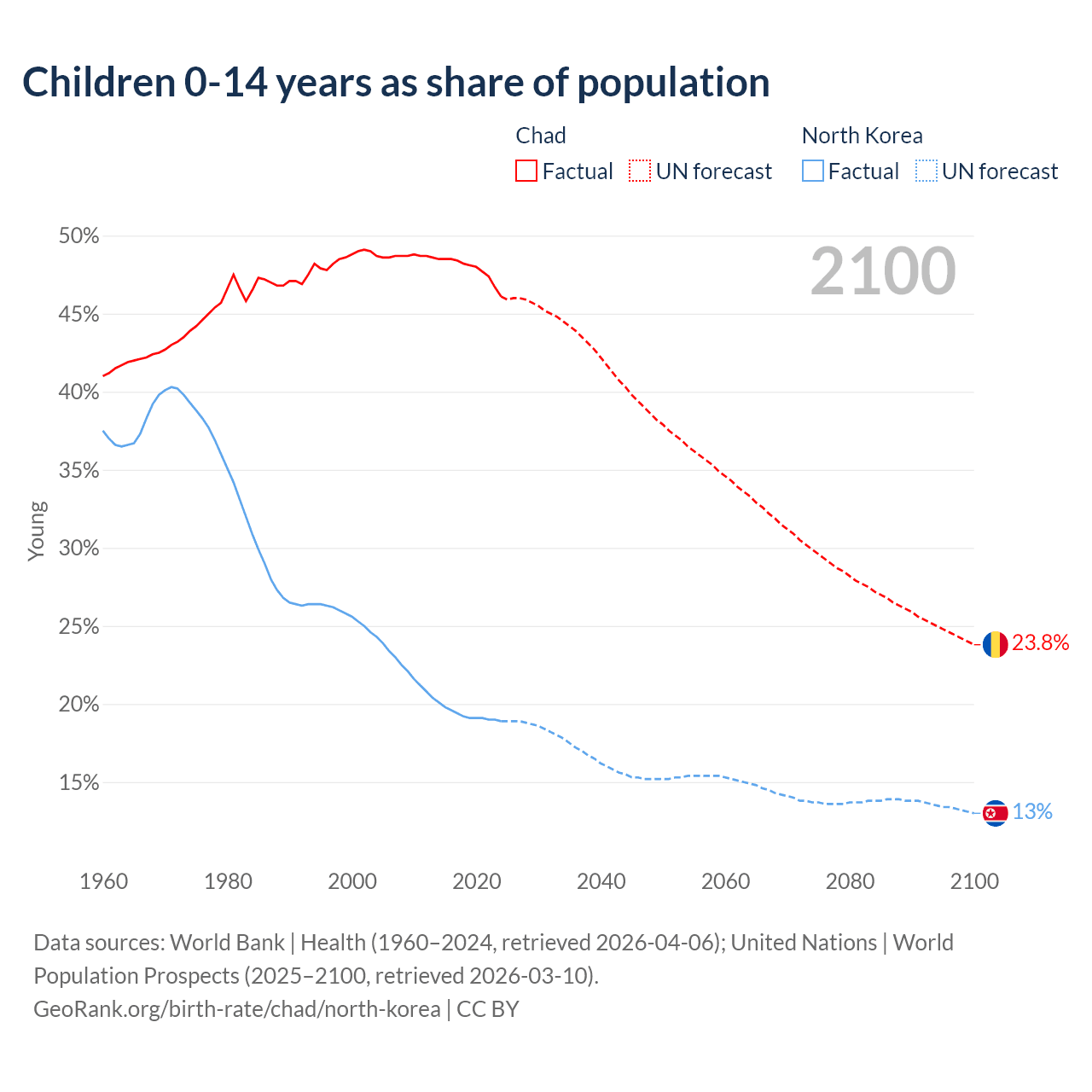 According to the latest available data on birth rates, the fertility rate in Chad was 6.12 children per woman in 2023, compared to 1.78 in North Korea in 2023. The replacement level is considered to be 2.1 children per woman.