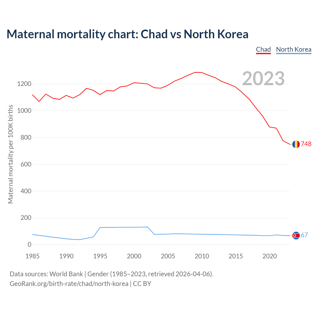 The maternal mortality rate, which is the probability of dying during childbirth or within 42 days of pregnancy termination, is 748 deaths per 100,000 live births in Chad, compared to 67 deaths in North Korea.