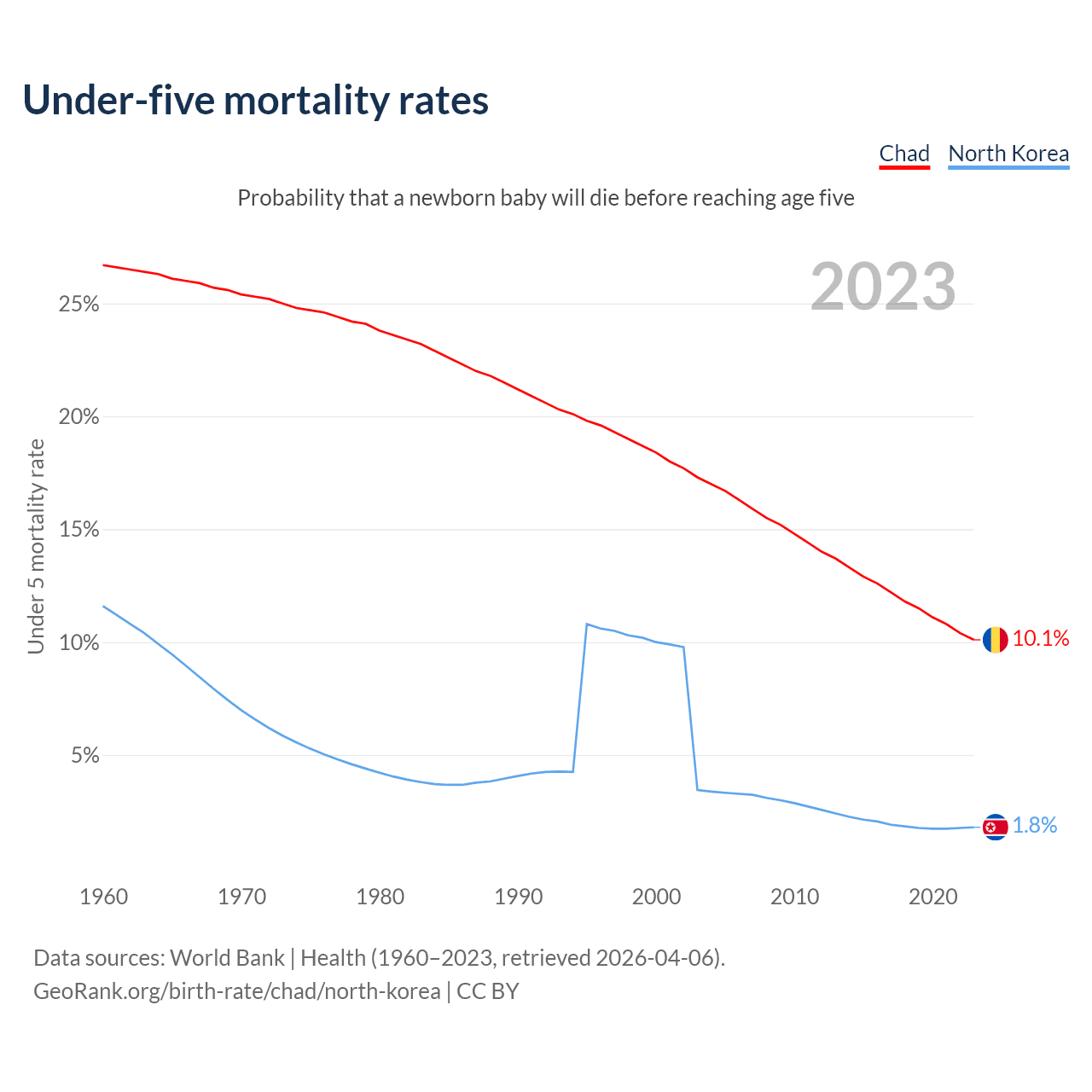 The chance that a newborn baby will die before reaching age five is 10.1% in Chad and 1.8% in North Korea. Above is a chart with historical data on under-five mortality rates.