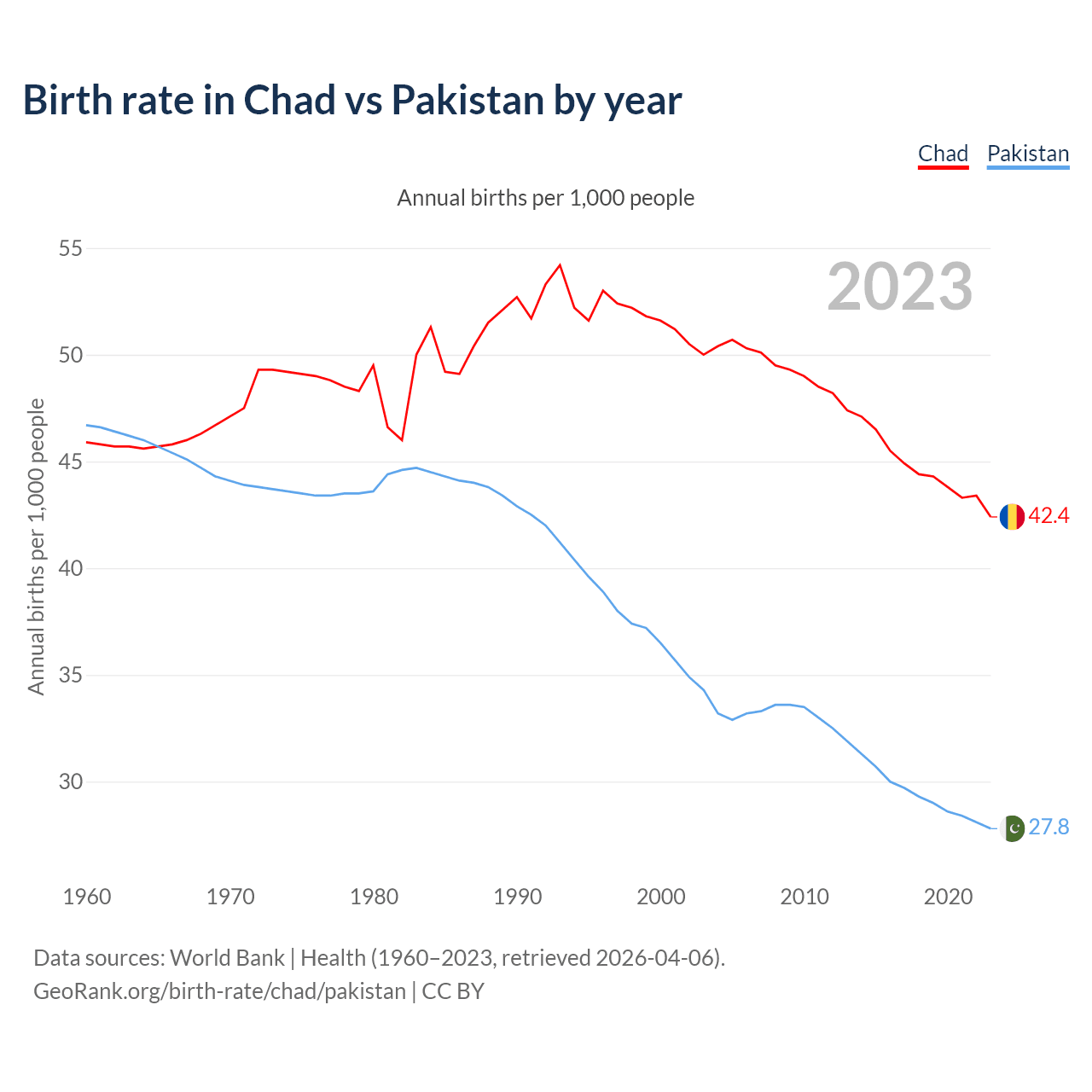 According to the latest available data on birth rates, the fertility rate in Chad was 6.12 children per woman in 2023, compared to 3.61 in Pakistan in 2023. The replacement level is considered to be 2.1 children per woman.