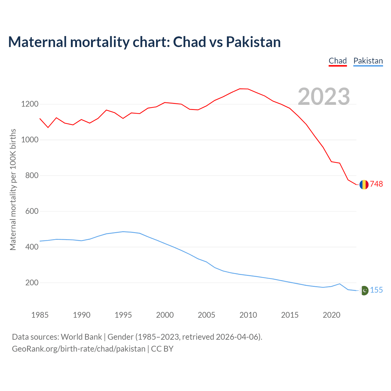 The maternal mortality rate, which is the probability of dying during childbirth or within 42 days of pregnancy termination, is 748 deaths per 100,000 live births in Chad, compared to 155 deaths in Pakistan.