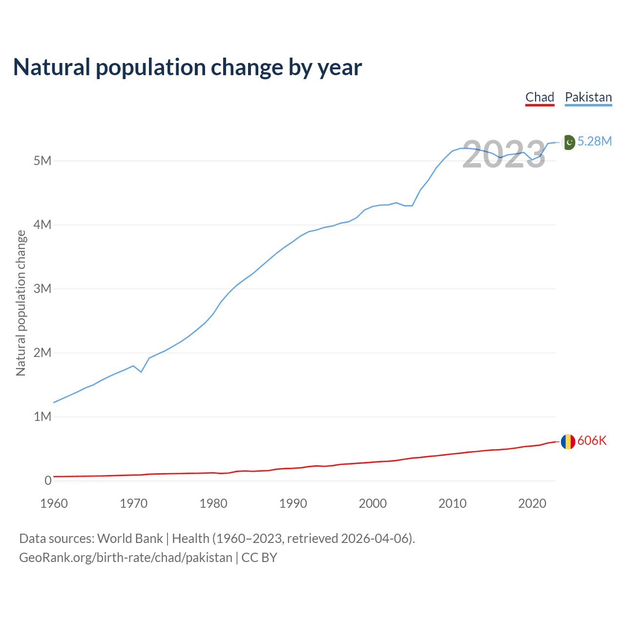 Chad has an annual birth rate of 42.4 births per 1,000 people, compared to 27.8 for Pakistan. The average number of children a woman is expected to have during her lifetime — the fertility rate, is 6.12 in Chad and 3.61 in Pakistan — 41.1% difference.