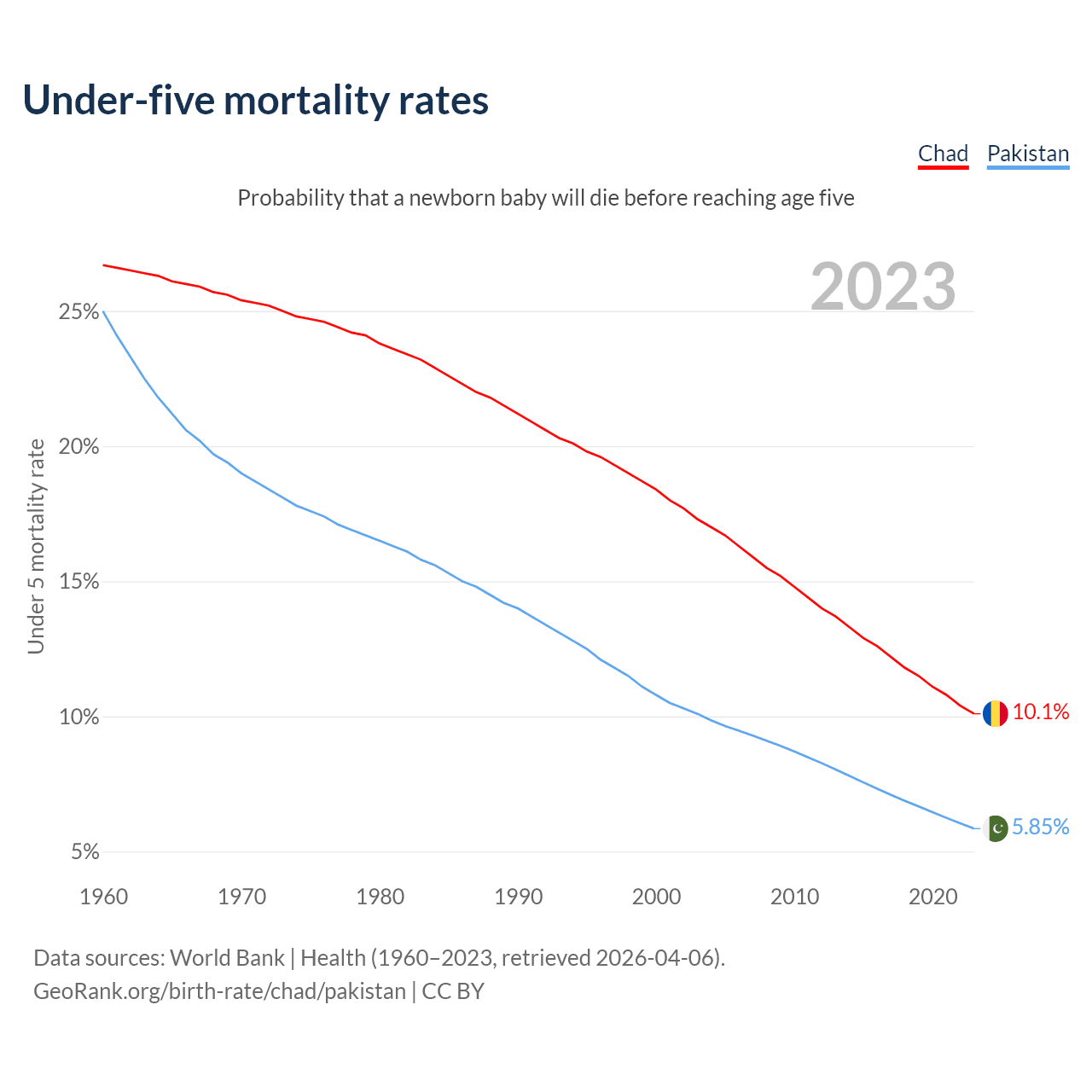 The chance that a newborn baby will die before reaching age five is 10.1% in Chad and 5.85% in Pakistan. Above is a chart with historical data on under-five mortality rates.