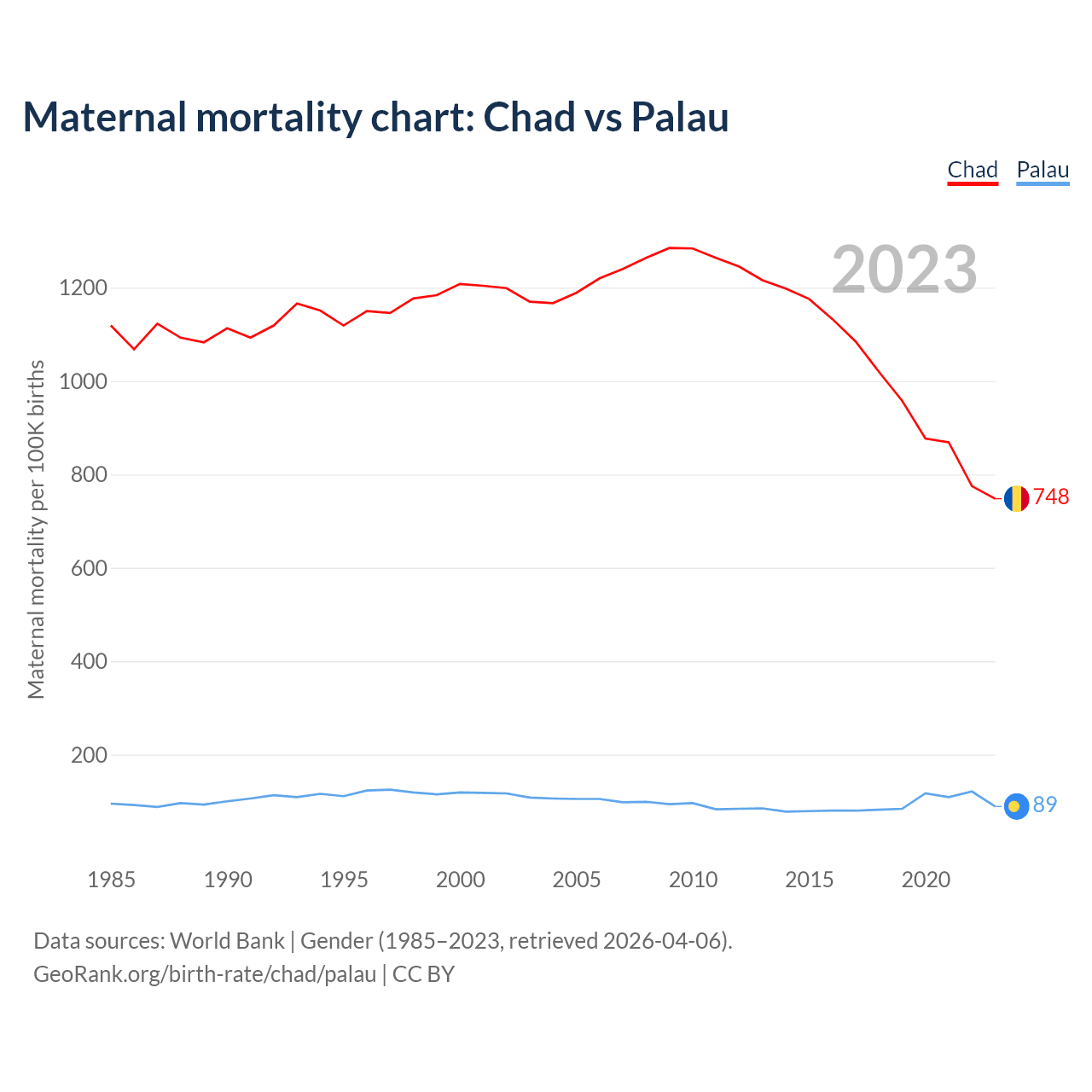 The maternal mortality rate, which is the probability of dying during childbirth or within 42 days of pregnancy termination, is 748 deaths per 100,000 live births in Chad, compared to 89 deaths in Palau.