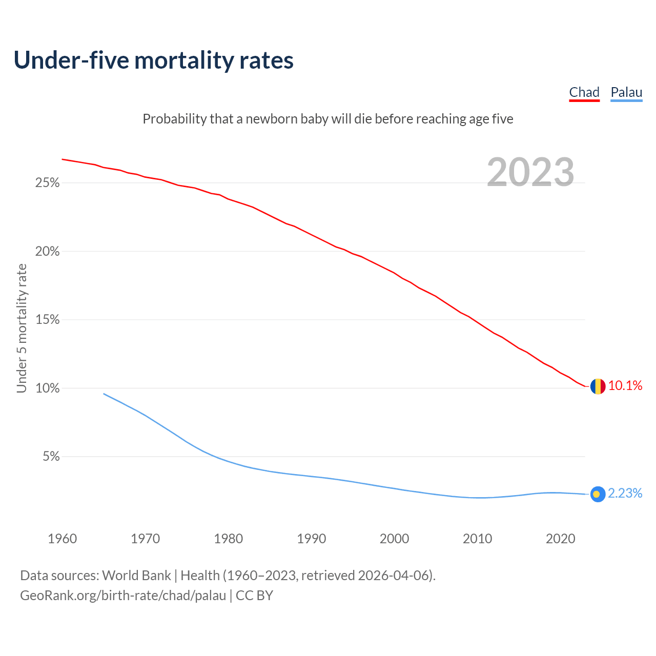 The chance that a newborn baby will die before reaching age five is 10.1% in Chad and 2.23% in Palau. Above is a chart with historical data on under-five mortality rates.