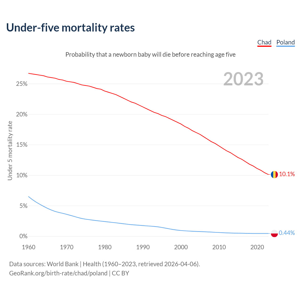 The chance that a newborn baby will die before reaching age five is 10.1% in Chad and 0.44% in Poland. Above is a chart with historical data on under-five mortality rates.