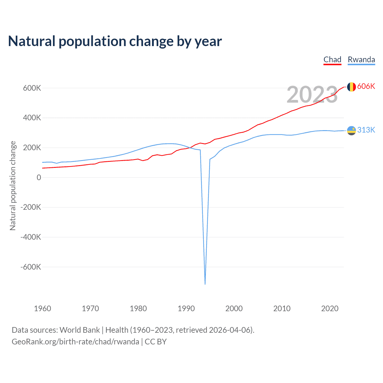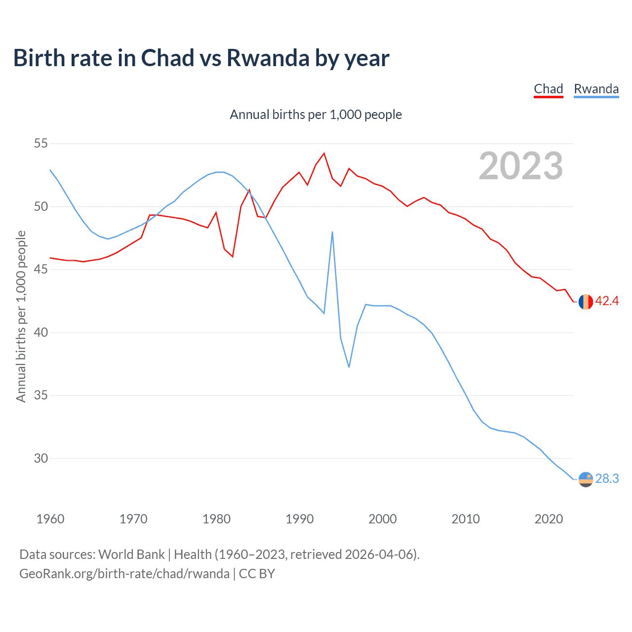 Chad has an annual birth rate of 42.4 births per 1,000 people, compared to 28.3 for Rwanda. The average number of children a woman is expected to have during her lifetime — the fertility rate, is 6.12 in Chad and 3.7 in Rwanda — 39.6% difference.